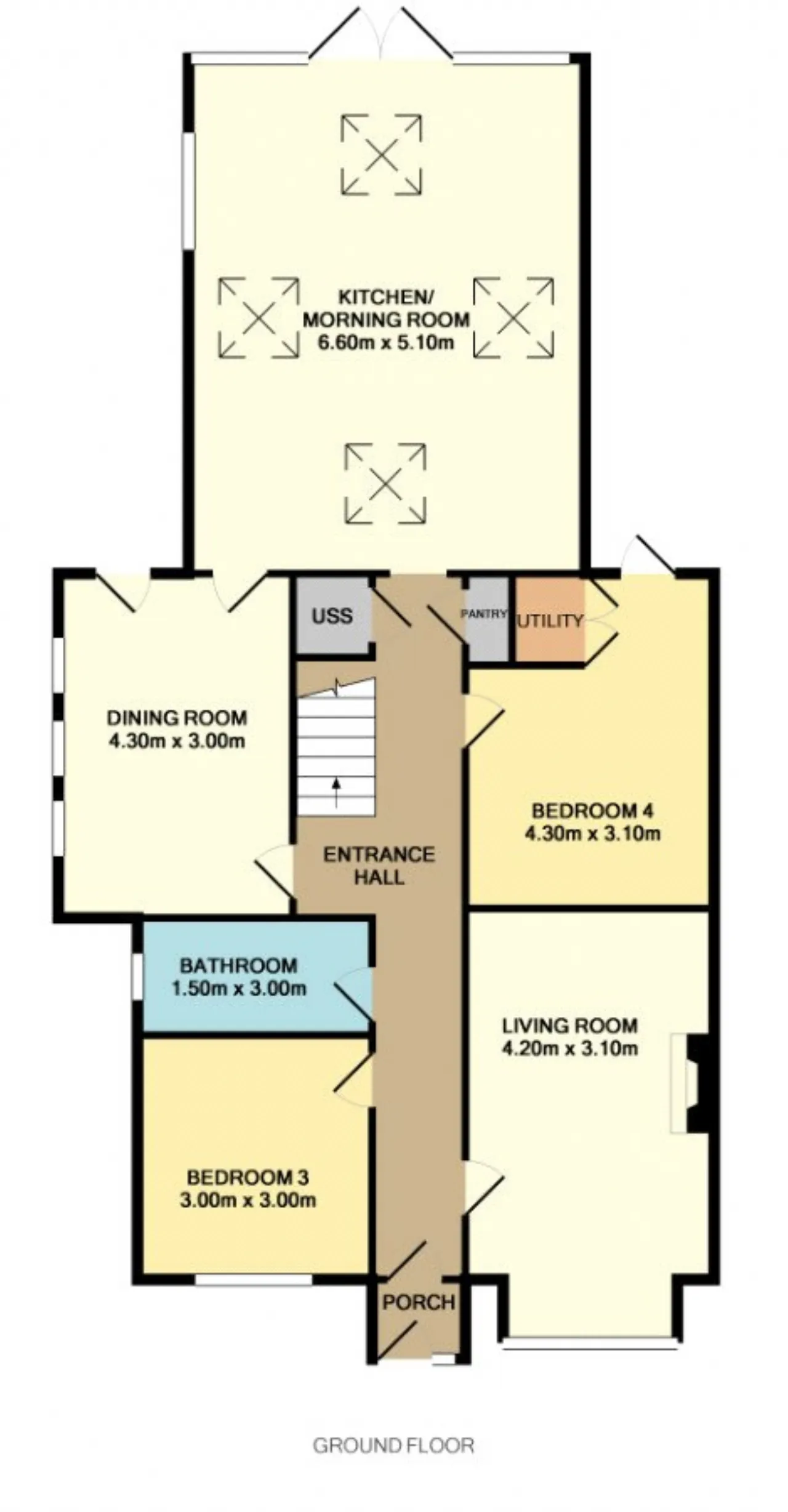 Dining Room 4.3m x 3.0m With Spanish marble tiled floor, picture rail, phone point, cast iron radiator and door to the garden.