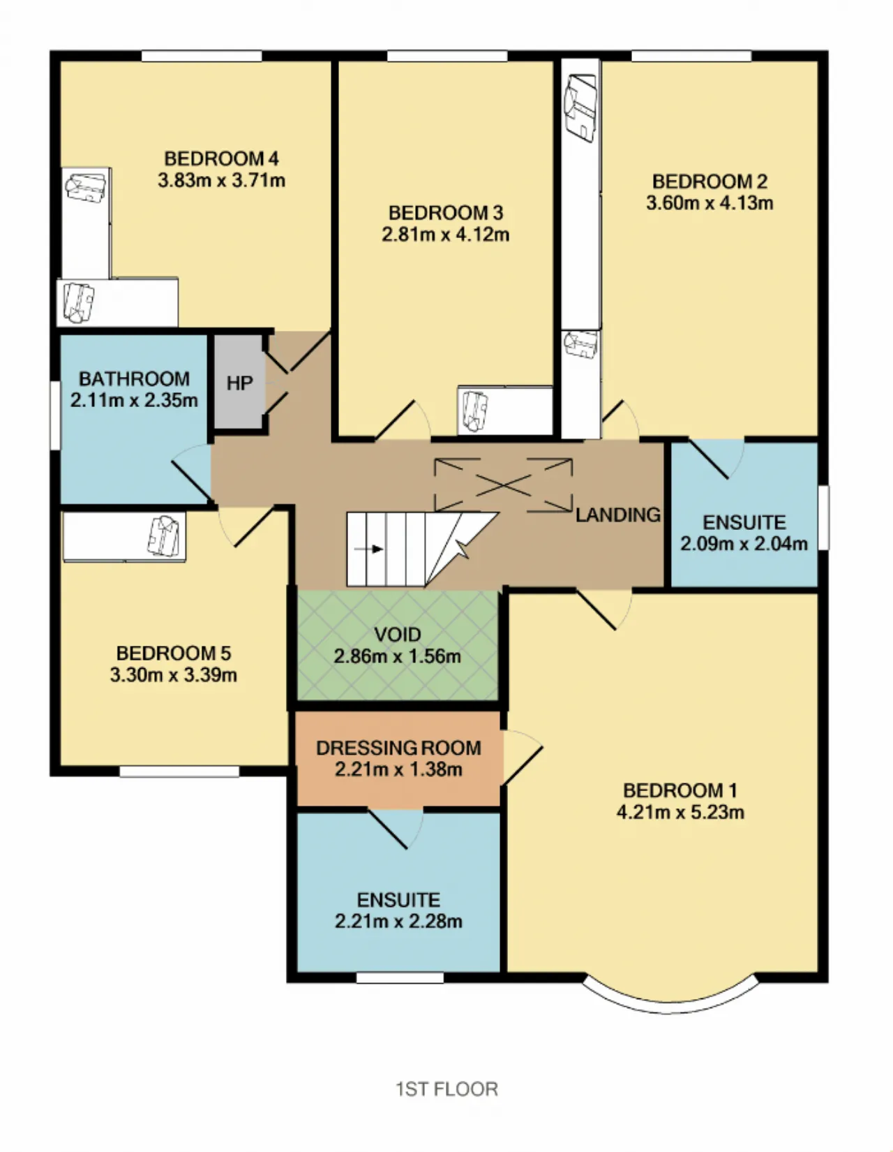 Bedroom 1 4.21m x 5.23m Main double bedroom to the front with bay window, ceiling coving with walk in dressing room