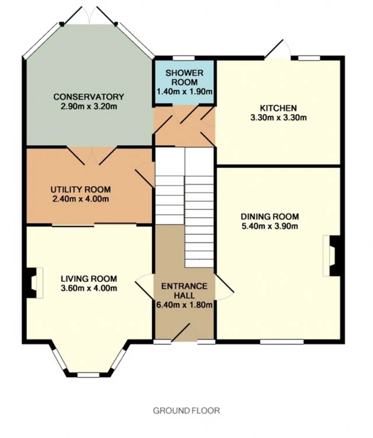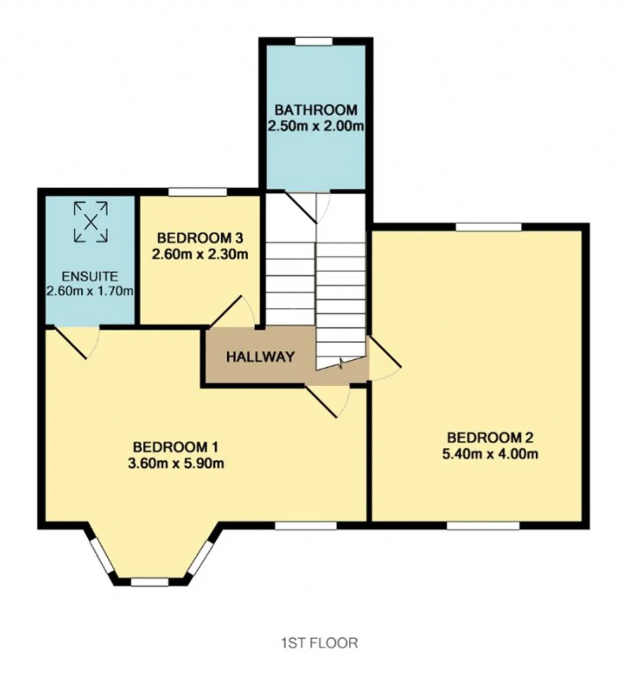 Bedroom 1 3.6m x 5.9m Double bedroom to the front with bay window, carpet floor and feature fireplace with cast iron mantle.