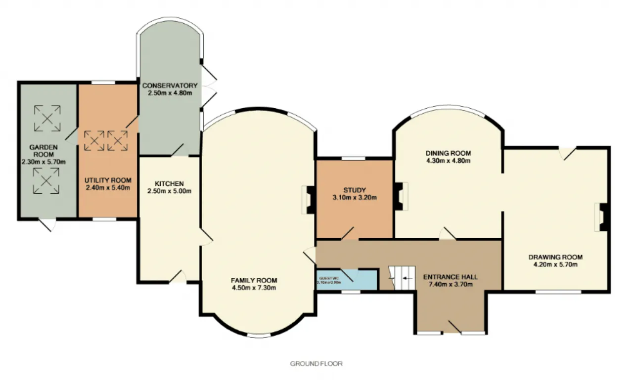 Family/Living Room 4.50m x 7.30m with two bow windows and French doors leading out to rear garden, beautiful marble fire place, solid Oak floor. Door to kitchen.
