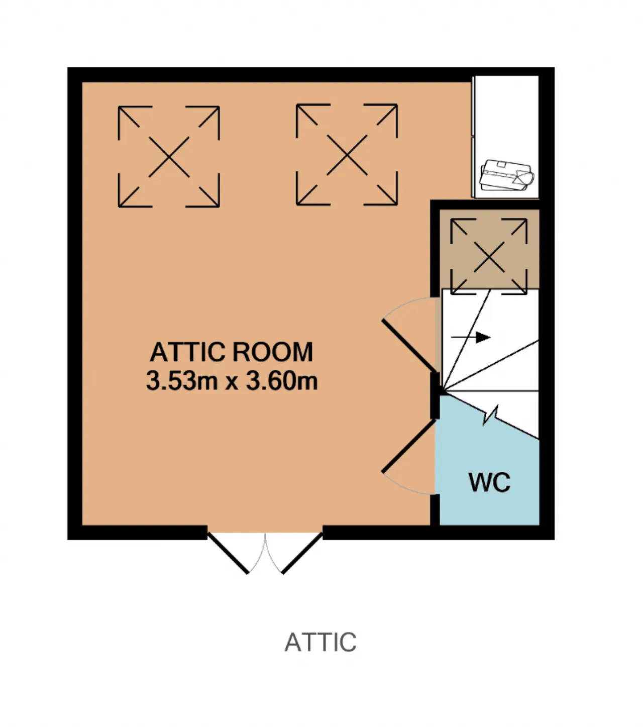 Attic Room 3.53m x 3.66m A large attic room currently laid out as a bedroom with Velux windows and good under eaves storage bays.