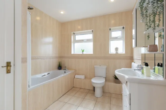 Bathroom 2.65m x 2.48m Tiled floor and walls, recessed lighting, wc, wash hand basin with understorage, two windows to rear, bath with shower attachment, fitted mirror and storage. Shelved Hot press.