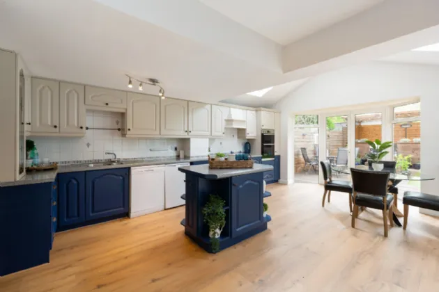 Kitchen/Dining 6.38m x 4.53m Laminate flooring, painted wooden kitchen units, tiled splashback, kitchen island with understorage, Indesit double oven, de Dietrich 4 ring electric hob, extractor, Powerpoint dishwasher, undercounter fridge, 1 1/2 stainless steel sink unit and drainer, pitched ceiling with 2 large Velux rooflights and French doors opening onto decking.