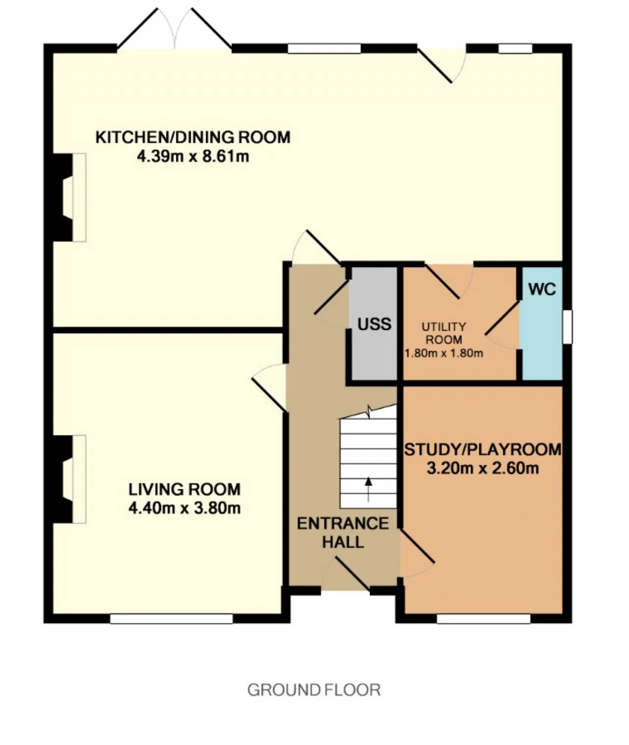 This property is ideally designed with modern day living in mind, the functional layout boasts excellent proportions and a high end contemporary finish. Beautifully presented throughout the ground floor comprises; entrance hall with under stairs storage, Lounge with attractive fireplace, Playroom / study, open plan kitchen/dining room with floor to ceiling windows, large utility room with door to the side and guest w.c. On the first floor there are three good sized bedrooms, each bedroom has fitted wardrobes, and there is a superb family bathroom.