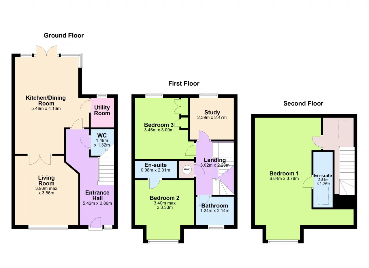 Upstairs on the first floor are two double bedrooms, one with ensuite and a main bathroom. There is a further study on this floor – perfect to use as an additional small room. On the top floor is the main bedroom suite featuring a luxurious ensuite. All of the rooms at the front of the house benefit from plantation shutters.