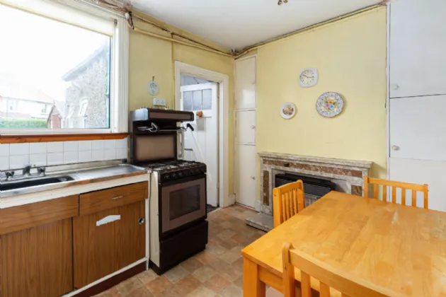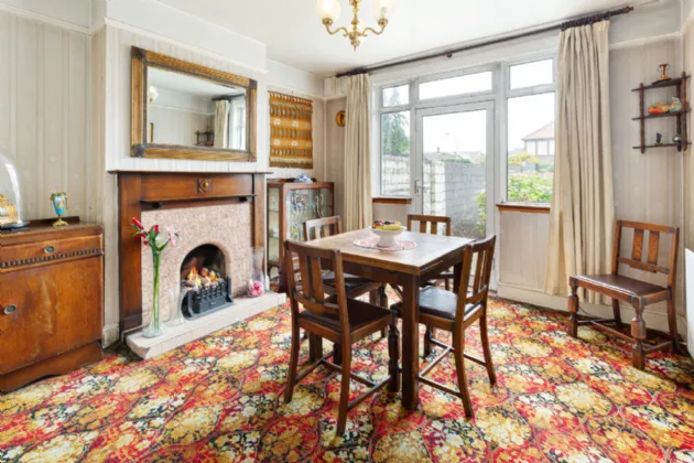 Dining Room 3.6m x 4.1m Situated at the rear of the home, this is a warm and inviting space with carpet flooring and picture rails that lend a traditional touch. A gas fire with a wooden surround adds comfort and charm, while a rear-facing window offers a lovely view over the large back garden.