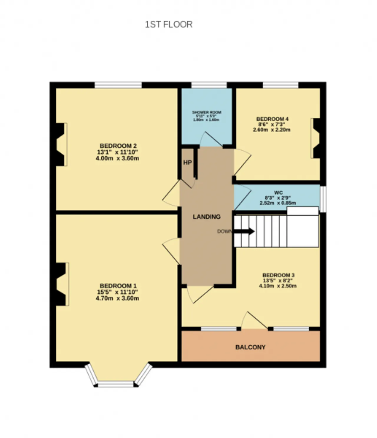 Bedroom 3 4.1m x 2.5m Situated at the front of the house, this charming bedroom enjoys its own private balcony, a rare and appealing feature. Finished with carpet flooring and picture rails, it offers a cosy yet distinctive space with lovely natural light.