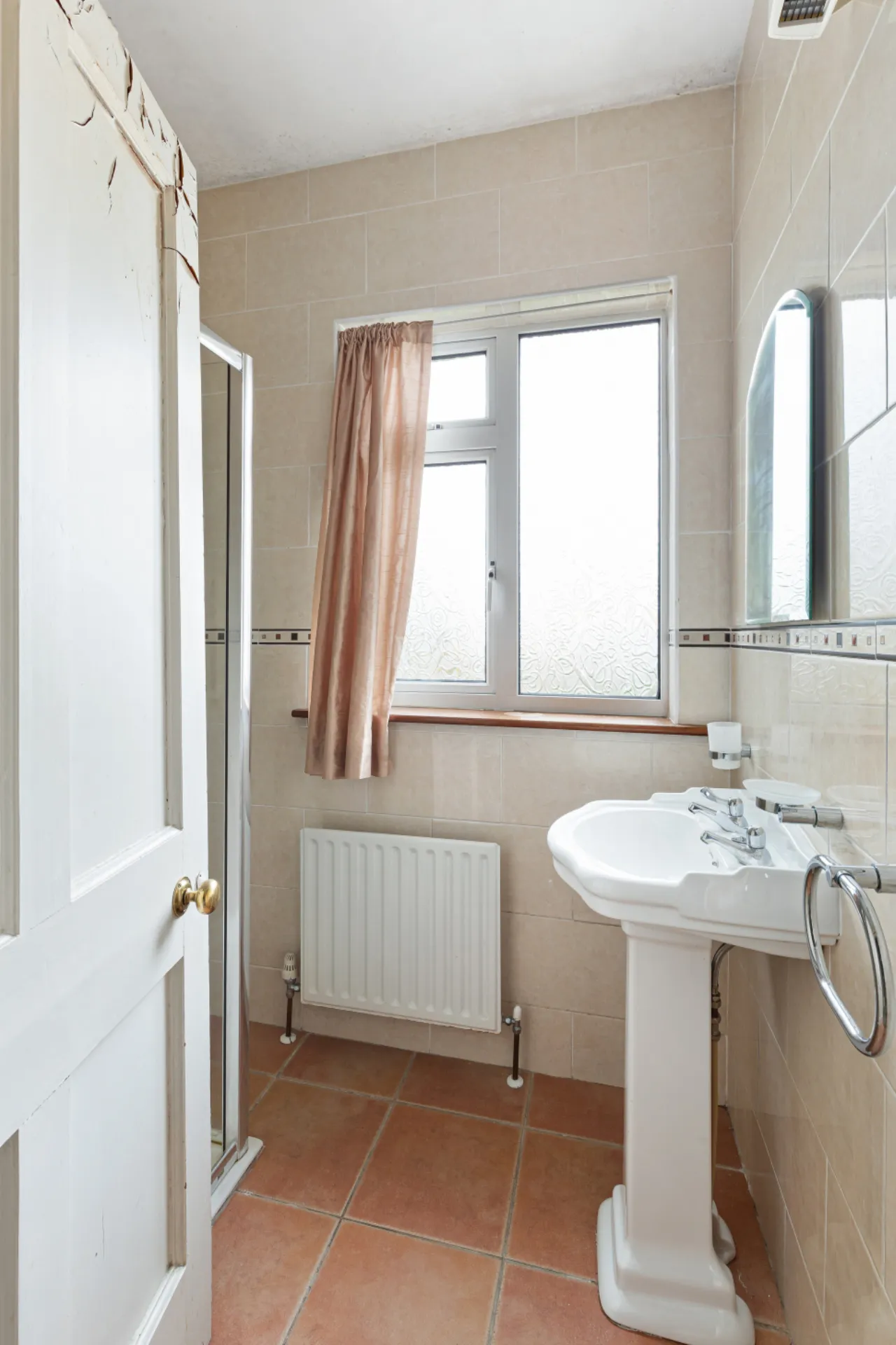 Bathroom 1.8m x 1.6m Fully tiled for ease of maintenance, this bathroom is fitted with an electric shower and a wash hand basin.