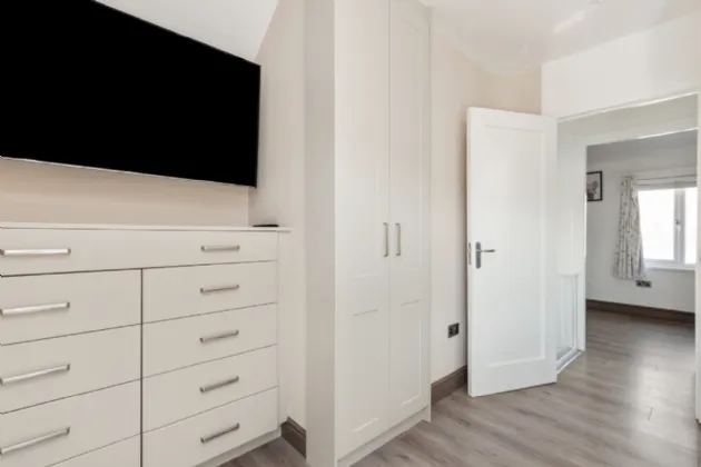 Bedroom 1 3.33m x 4.17m Double bedroom located to the front of the house. It features stylish laminate wooden flooring, elegant wood paneling, recessed lighting, and built-in wardrobes, creating a warm and functional space.