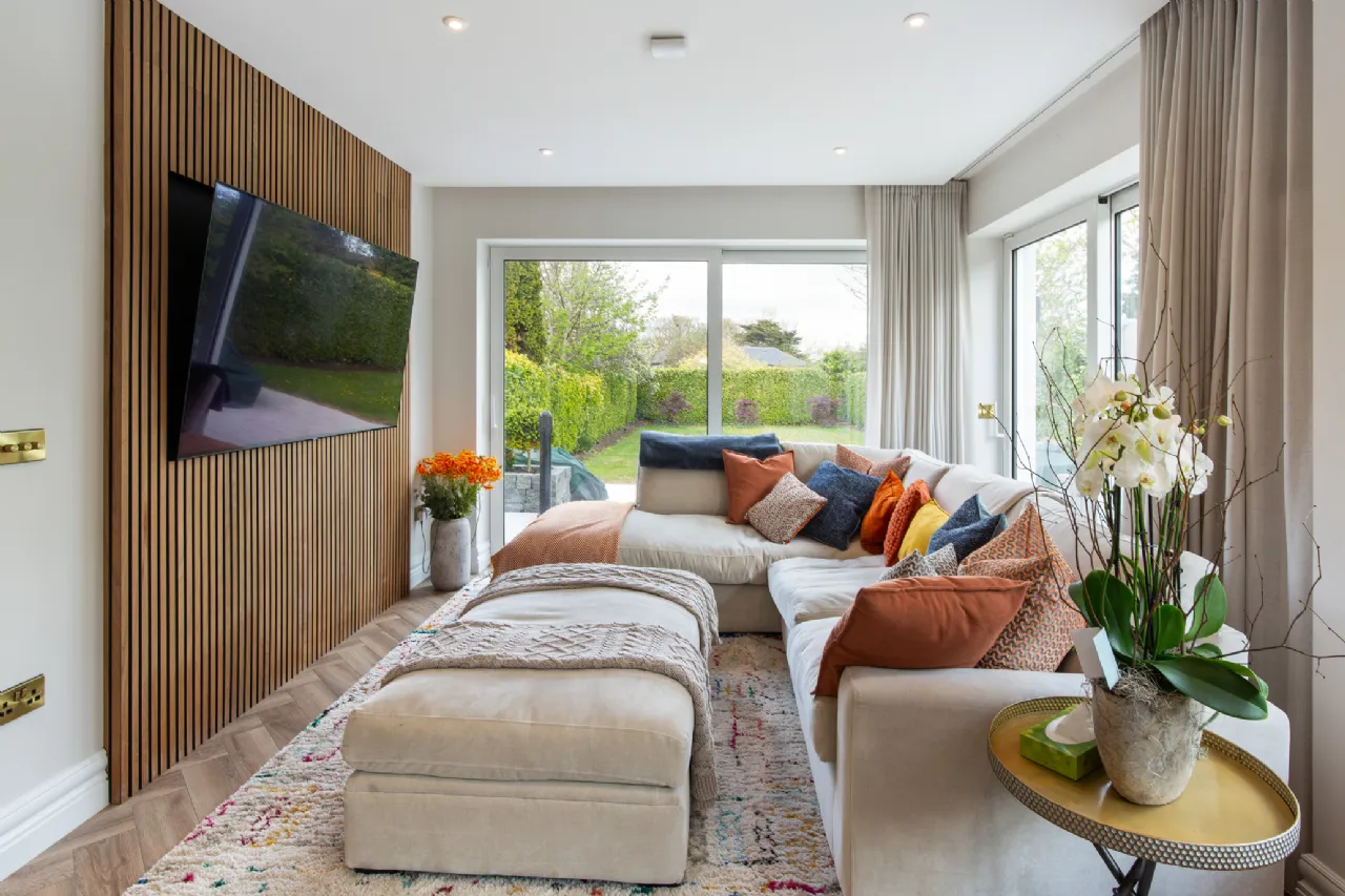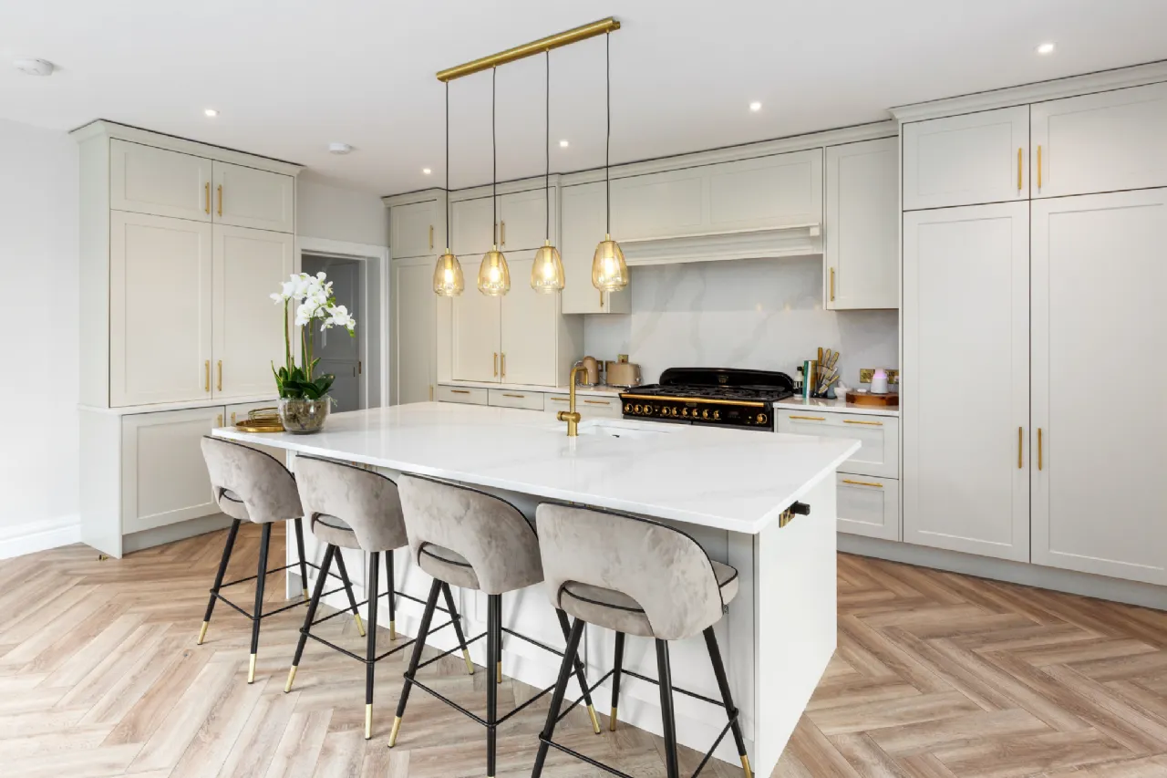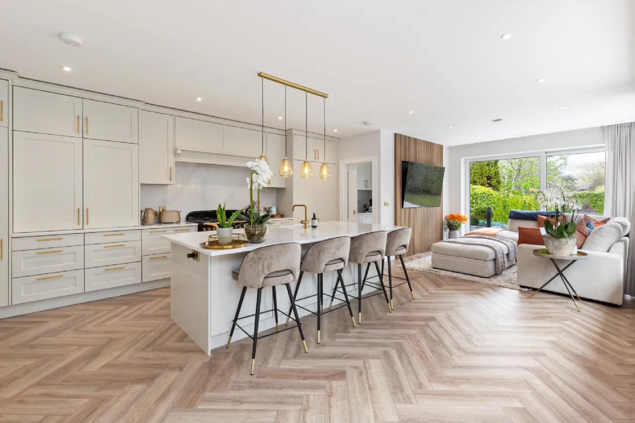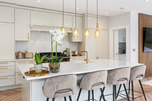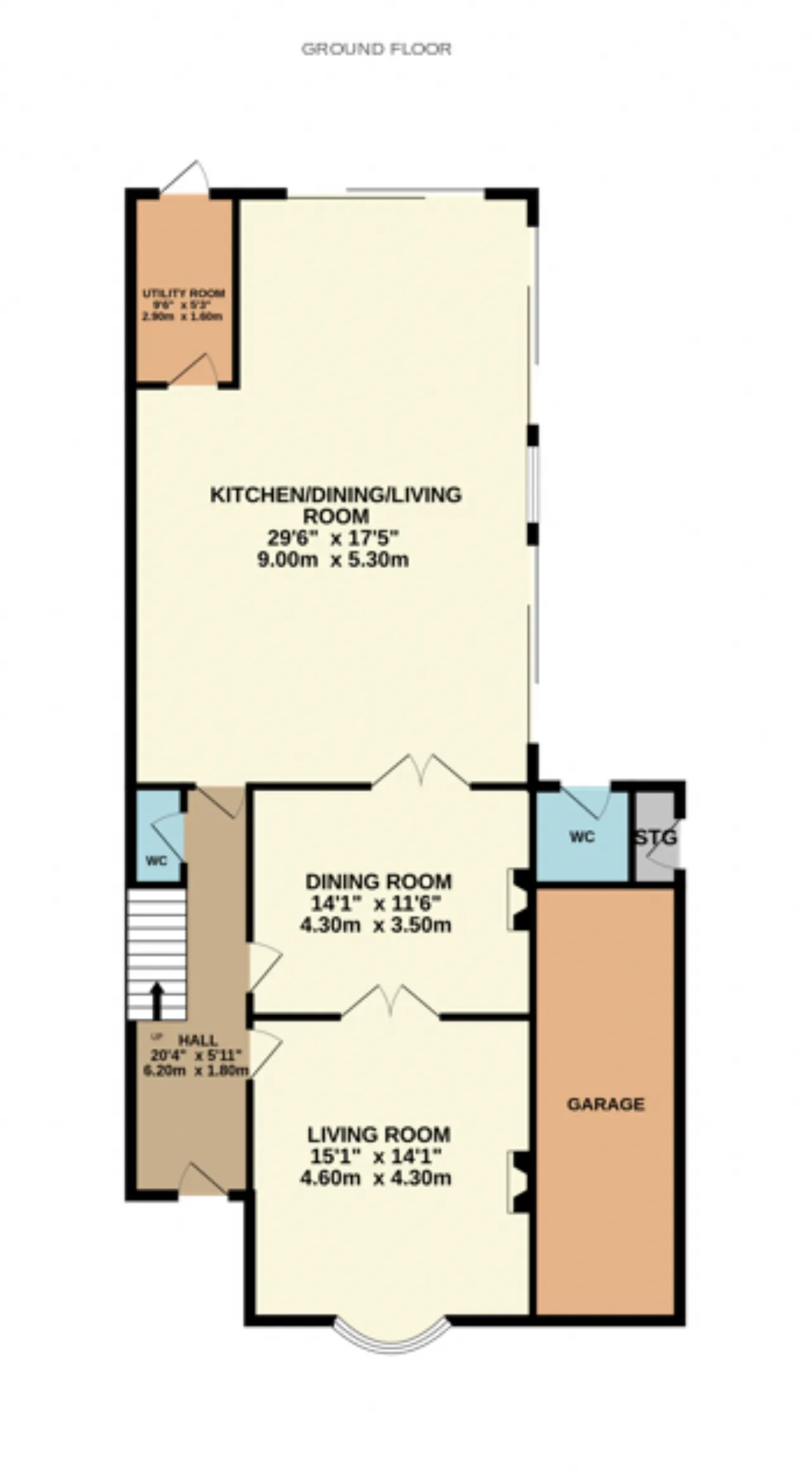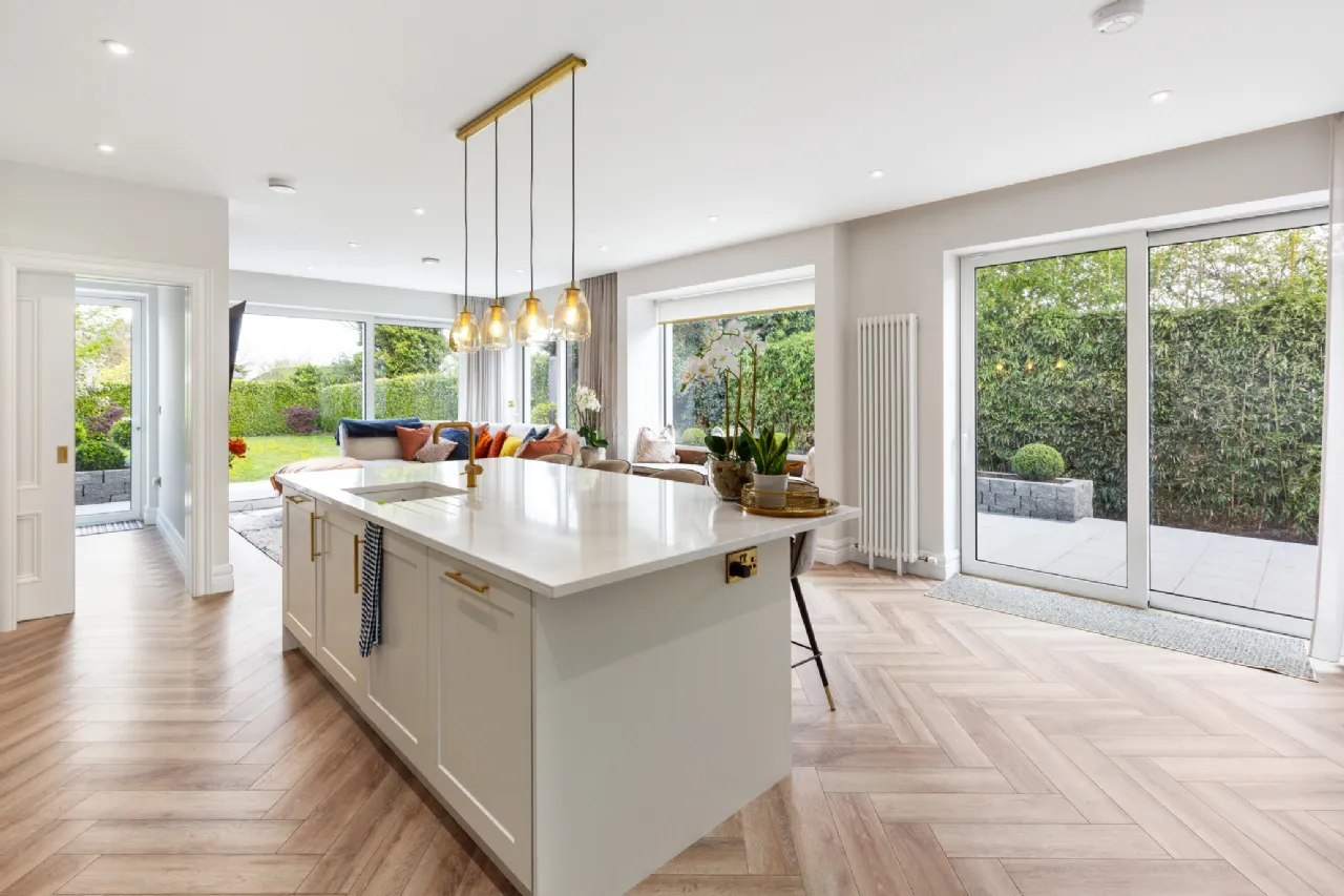 Kitchen/ Living/ Dining 9m x 5.5m This is a spectacular kitchen extension, full of light pouring through sliding doors, windows and roof lights. The kitchen is fitted with a vast amount of floor and wall units with integrated appliances including fridge, freezer and dishwasher. The large island doubles as a breakfast bar. The worktop and island are topped in marble. There is space for a dining table and a large seating area. Sliding doors lead to the patio to the side and rear of the house. A window seat is a great spot to enjoy views of the garden.