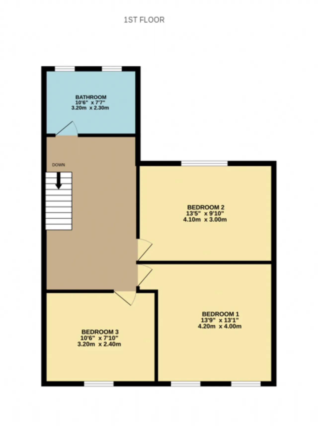 Bedroom 1 4.2m x 4m Large double room to the front of the house with oak flooring, two large windows with stained glass insets and ceiling covings.