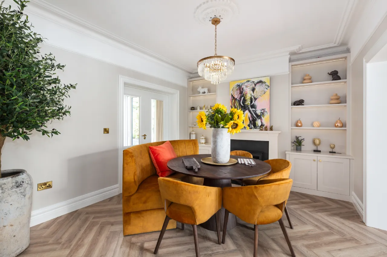 Living Room 4.6m x 4.3m Beautiful living room to the front with bay window flooding the room with light. A limestone fireplace creates a lovely focal point with built in storage and shelving in both alcoves. The floor is laid in semi solid oak with original features including ceiling covings and rose and picture rails. Pocket doors lead to the dining room.