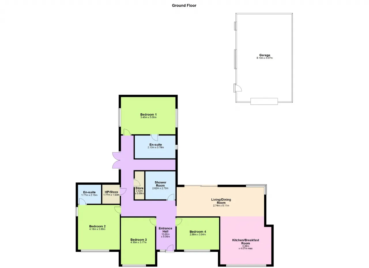 The property boasts the perfect balance and flow of living and bedroom accommodation. Internally the accommodation comprises of a welcoming entrance hall which you can access via the front, and this connects you to all of the rooms, there is a large bespoke kitchen/breakfast/dining room with a sliding door to the rear garden. As you enter the front, to the right there is a bedroom which boasts a large picture window overlooking the front, on the left side of the hallway is another bedroom, you are then lead through to the main bathroom which is fully tiled, there are two further double bedrooms down the hallway and both are equipped with ensuites. Off the hallway there are two storage cupboards. The notable feature of this property is the natural flow of accommodation and windows throughout which flood the property with an abundance of natural light. The design is truly unique.