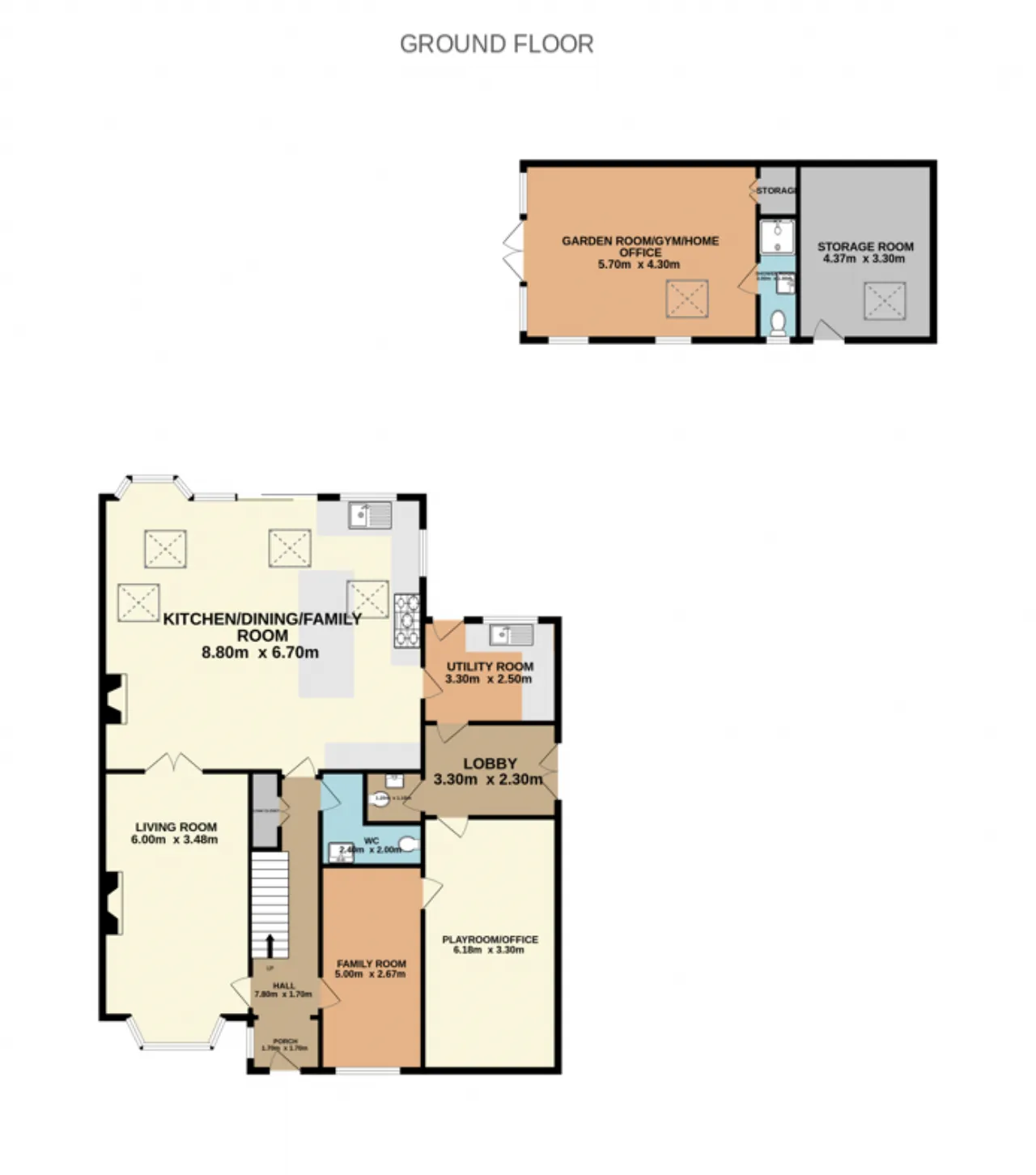 Garden Room 5.7m x 4.3m A versatile and impressive garden room that could be used for a multitude of uses including gym, office, playroom etc., c.3.3m high ceiling with Velux roof light. Fitted storage cupboard, laminate timber flooring. Contains a shower room and could be converted to living accommodation subject to PP.