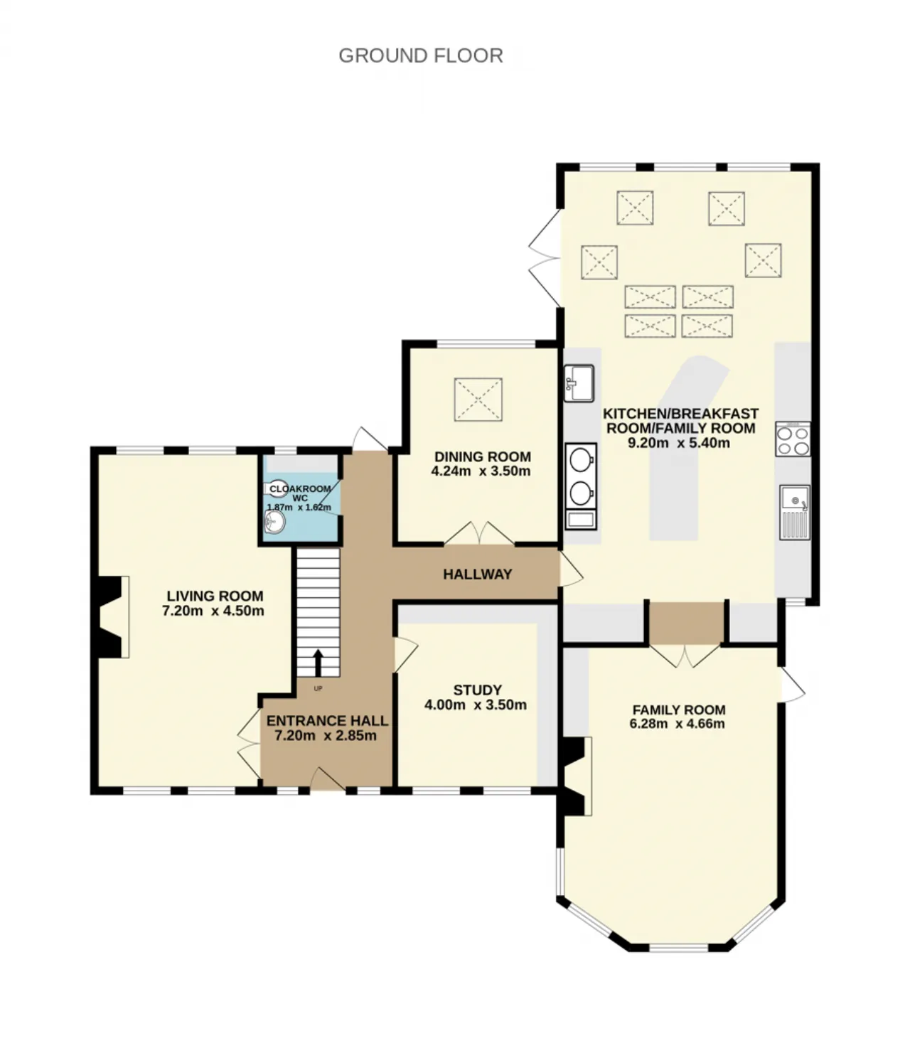 Family Room 6.28m x 4.66m Accessed from the kitchen through double doors, this generous family room features a beautiful bay window to the front, a raised solid-fuel fireplace and bespoke built-in shelving and desk space. Finished with oak timber flooring and offering a door to the side passage.
