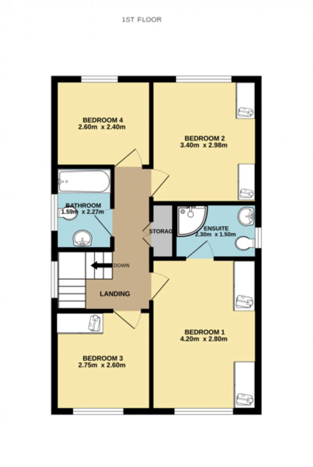 Bedroom 1 Located to the front of the house, with carpet flooring. Fitted wardrobes, with overhead cabinets, provide ample storage space to this generous, double bedroom.