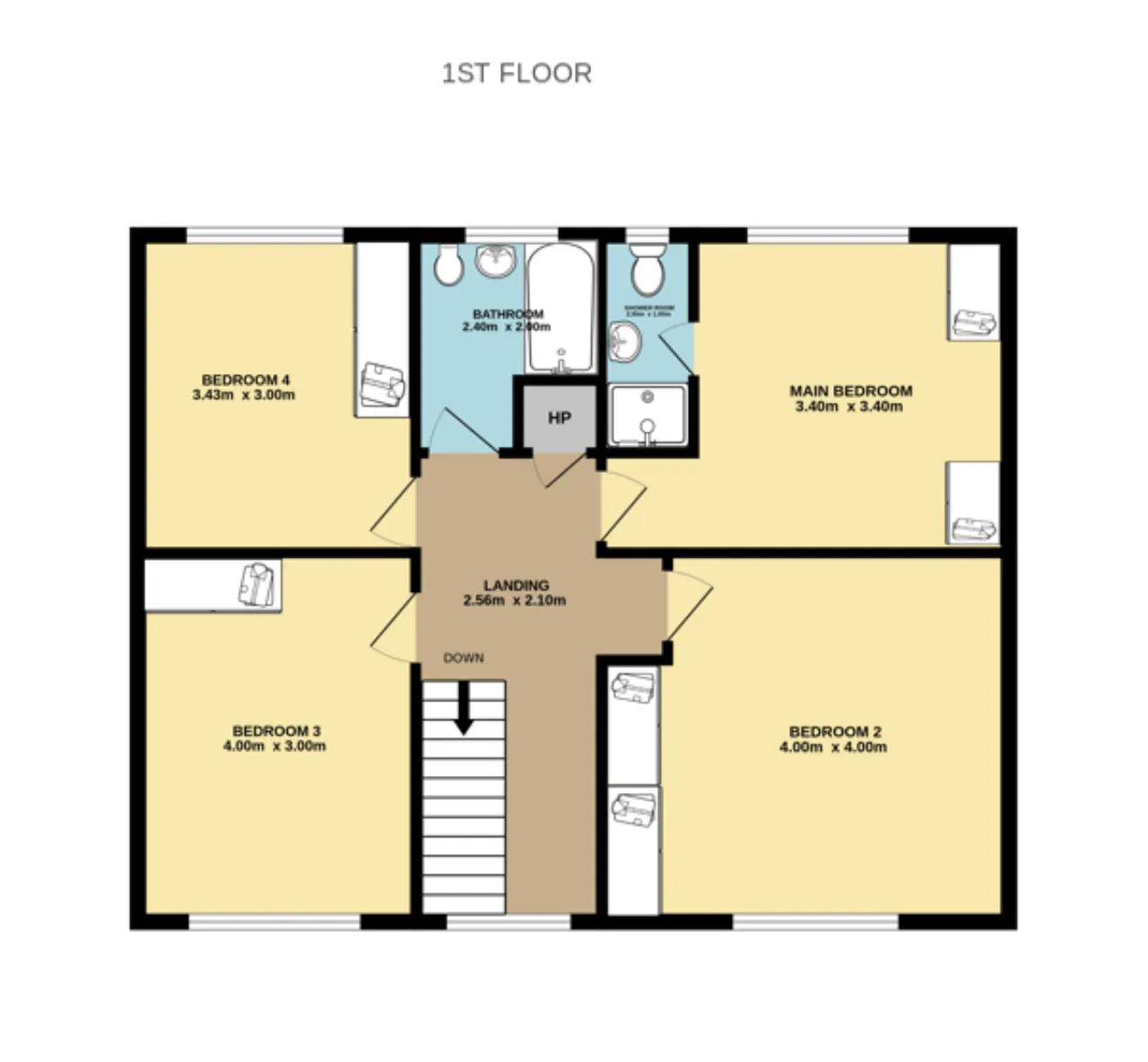 Main Bedroom 3.4m 3.4m Double bedroom to the rear of the property with 2 sets of fitted wardrobes and obverhead storage.