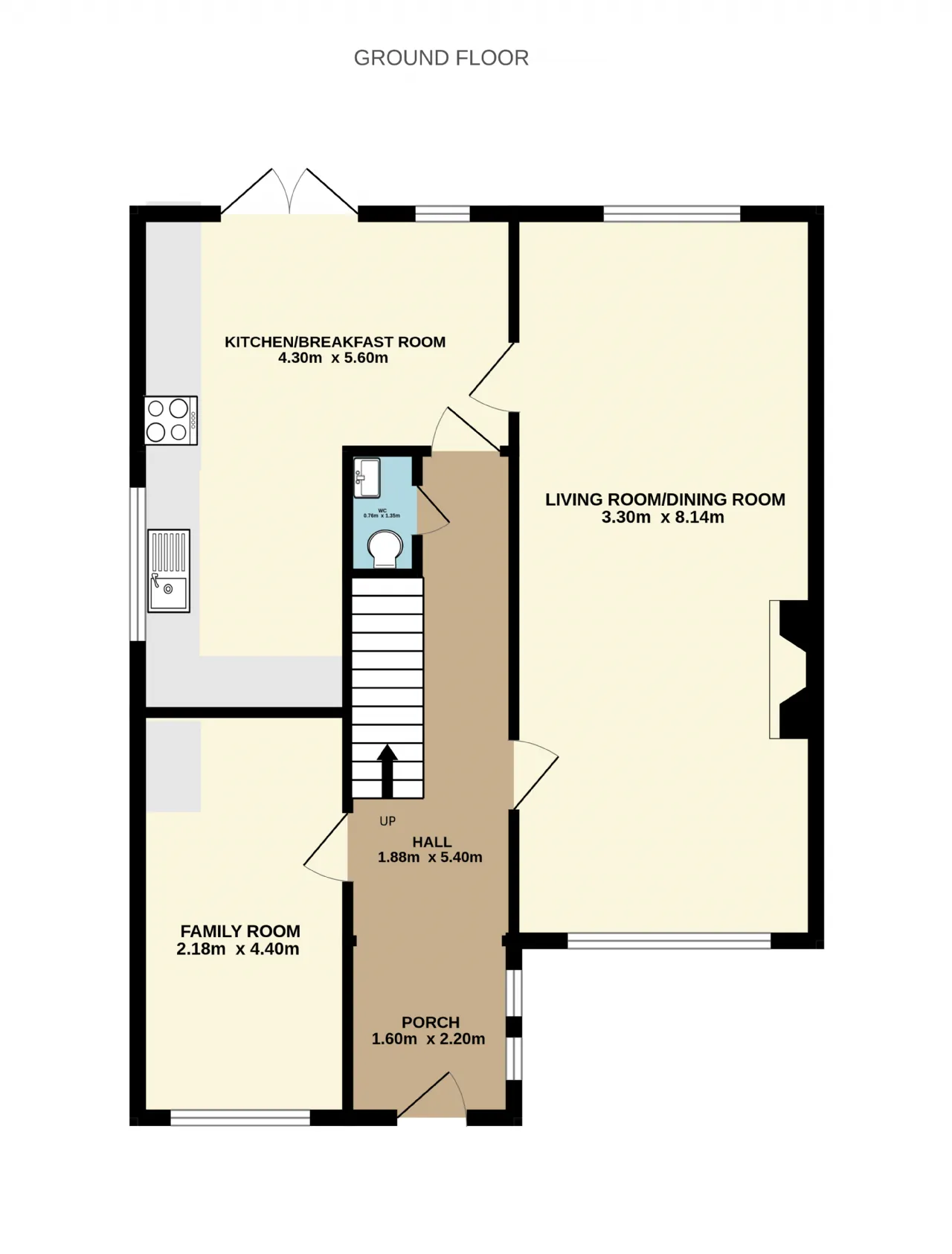 Guest WC 1.3m x 0.7m Neatly tucked away under the stairs, contains wc and wash hand basin.