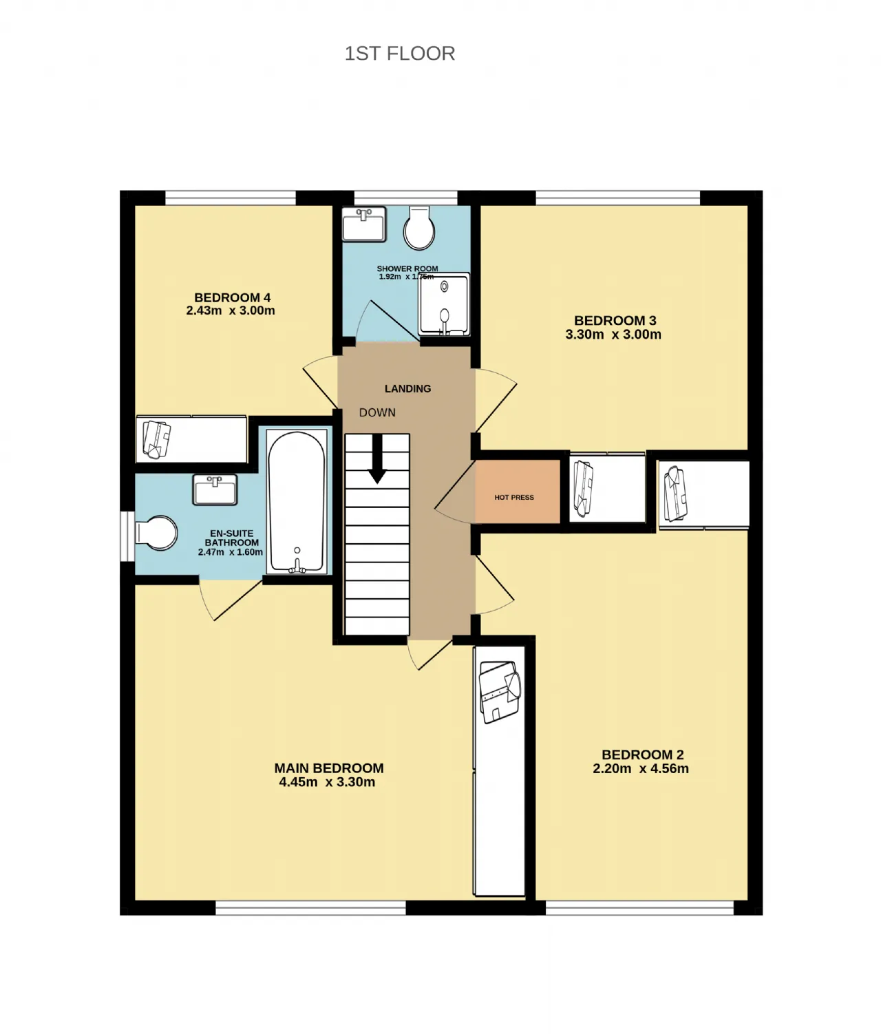 Landing 3.3m x 1.97m With hot-press and access hatch to attic.