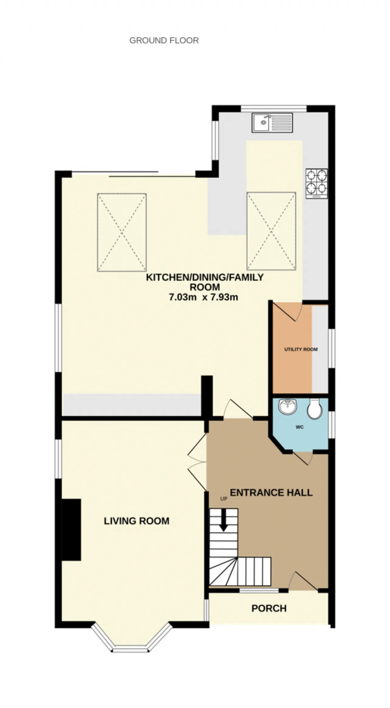 Family/Dining Room 7.9m x 7m The heart of this home is this impressive spacious open plan area spanning the width of the property and incorporating the extended kitchen. This light filled room has lots of living space with a family area with fitted wall units as well as a dining area looking out onto the rear garden through the impressive glass sliding doors. The room is all open plan and leads to the modern kitchen with extensive range of wall and floor level bespoke units with marble countertops, sink unit and drainer, integrated hob, Neff oven and grill, fridge freezer and dishwasher, there is a breakfast counter dividing the kitchen and dining area with marble countertops, door to utility room.