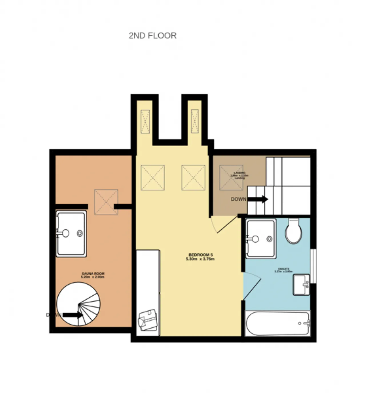 Sauna room/Store 5.2m x 2m Access via a spiral staircase, currently in use as extra storage/wardrobe. Plumbed.