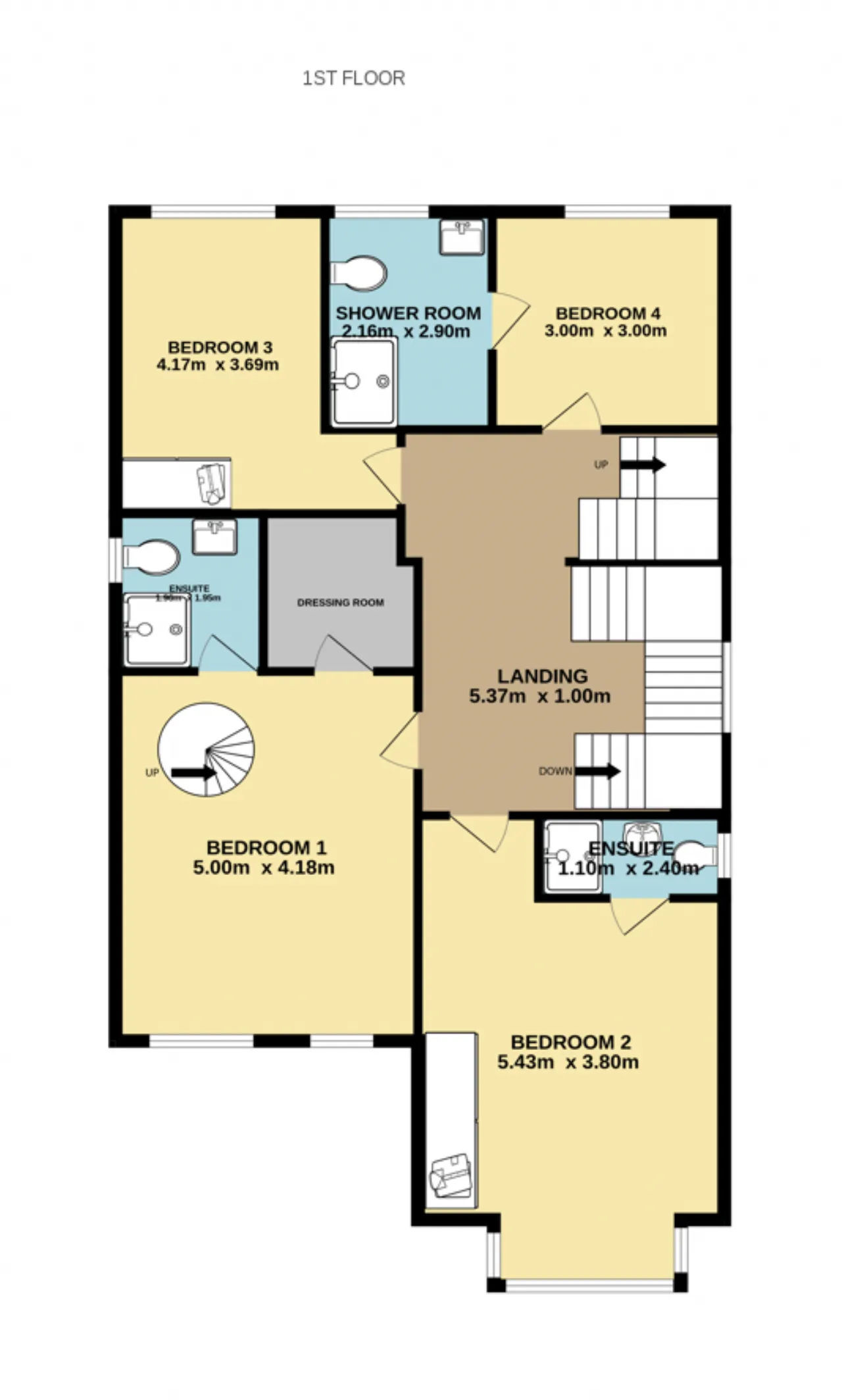 Upstairs on the first floor are four generously proportioned double bedrooms, with ample storage and fitted wardrobes in three of the rooms. Two bedrooms benefit from en-suite bathrooms, while the principal suite also features a walk-in wardrobe and a spiral staircase leading to a private upper-level storage space/sauna area. A luxurious family bathroom completes this level. The second floor contains a spacious fifth double bedroom with fitted sliderobes and an en-suite, offering an ideal retreat for guests or older children.