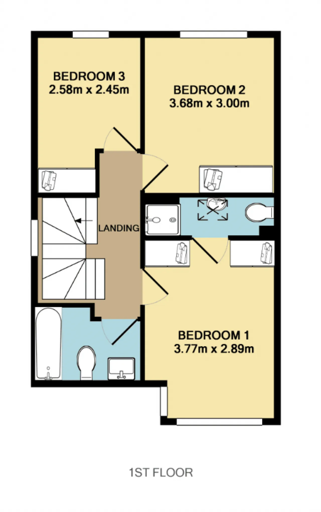 Bedroom 3 2.58m x 2.45m Generous third bedroom, with modern laminate flooring and built in wardrobes.