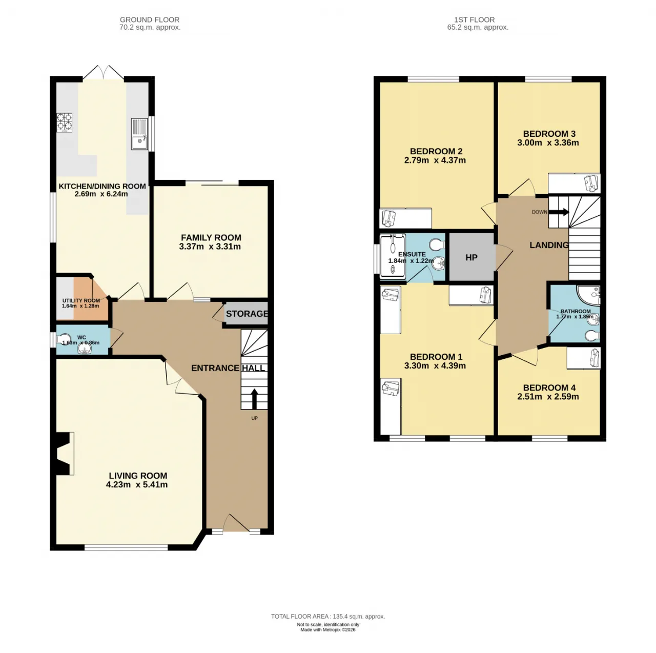 The ground floor accommodation begins with a bright and spacious entrance hall, Including a guest WC and practical cloakroom area. The well-proportioned living room features a marble fireplace, creating a warm and welcoming focal point. To the rear, the recently installed modern kitchen/breakfast room offers generous counter space and ample storage, providing an ideal setting for both day-to-day family life and entertaining. A separate utility room further enhances the practicality of the home, offering additional storage and laundry space. Upstairs, there are three excellent double bedrooms, including a main bedroom with en-suite, a fourth single bedroom, and a well-appointed family bathroom.