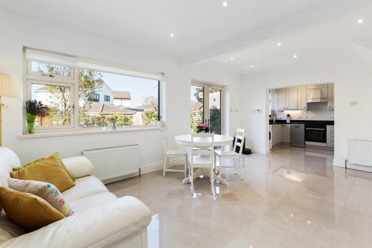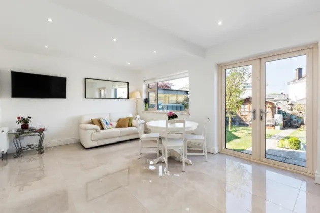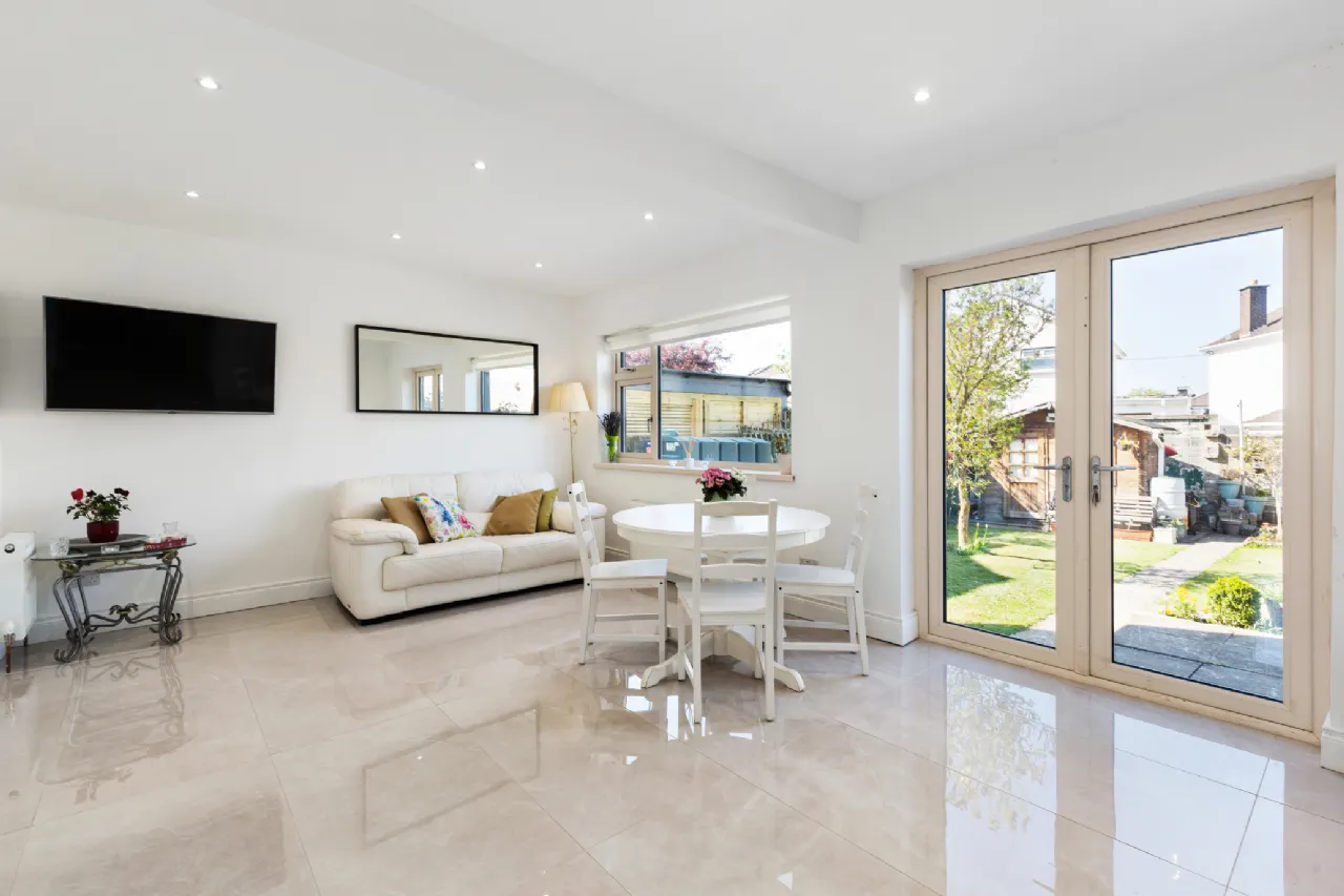 Family/Dining Room 5.5m x 3.7m Open plan dining/family room with polished porcelain Italian tiling, double doors to rear garden. Open arch to kitchen.