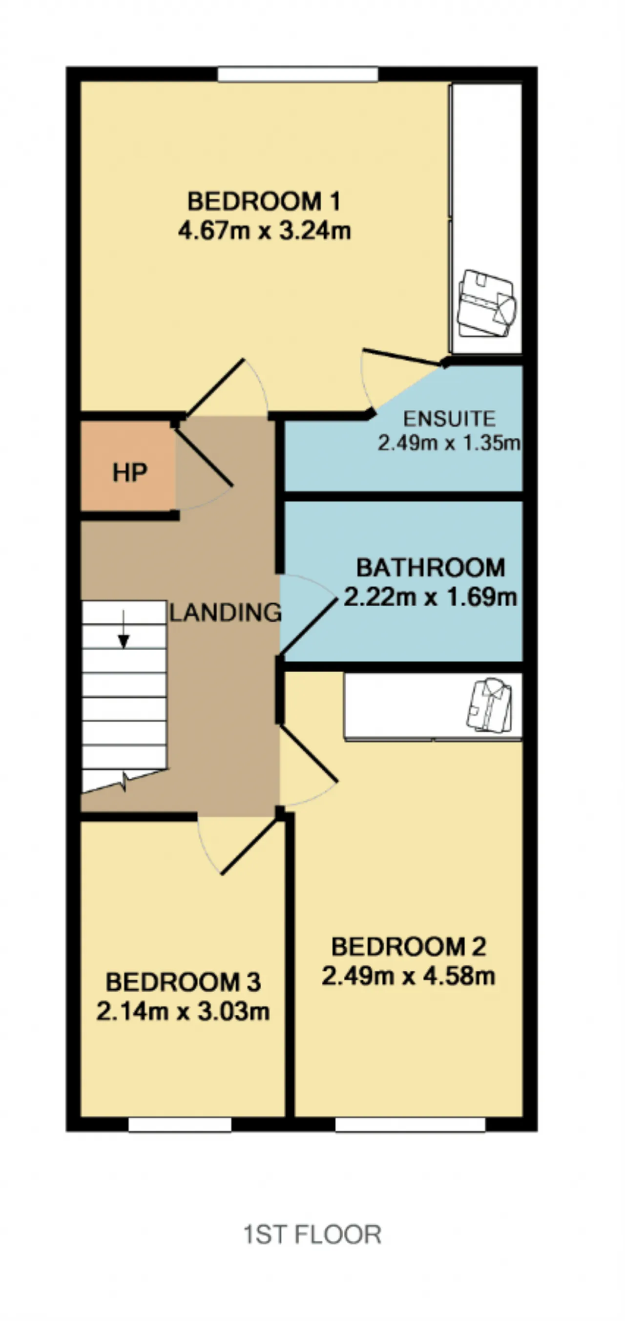 En-suite 2.5m x 1.35m Contains a 3 piece suite, tiled shower, wc and whb, tiled floor.