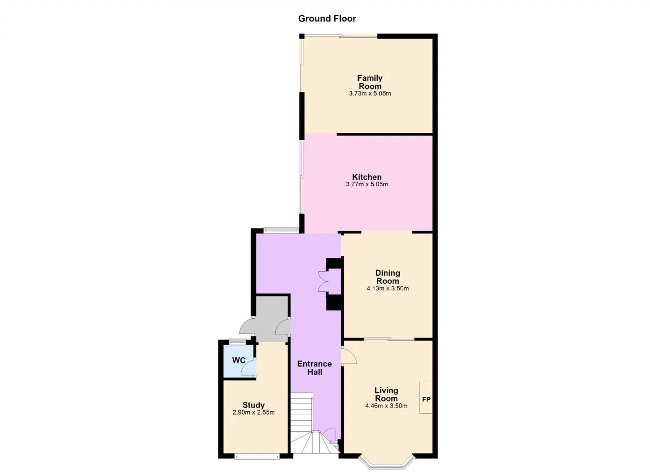 Kitchen 3.77m x 5.05m With solid wood floor, ample wall and floor units, oven, 5 ring gas hob, integrated appliances and sliding door to rear garden.