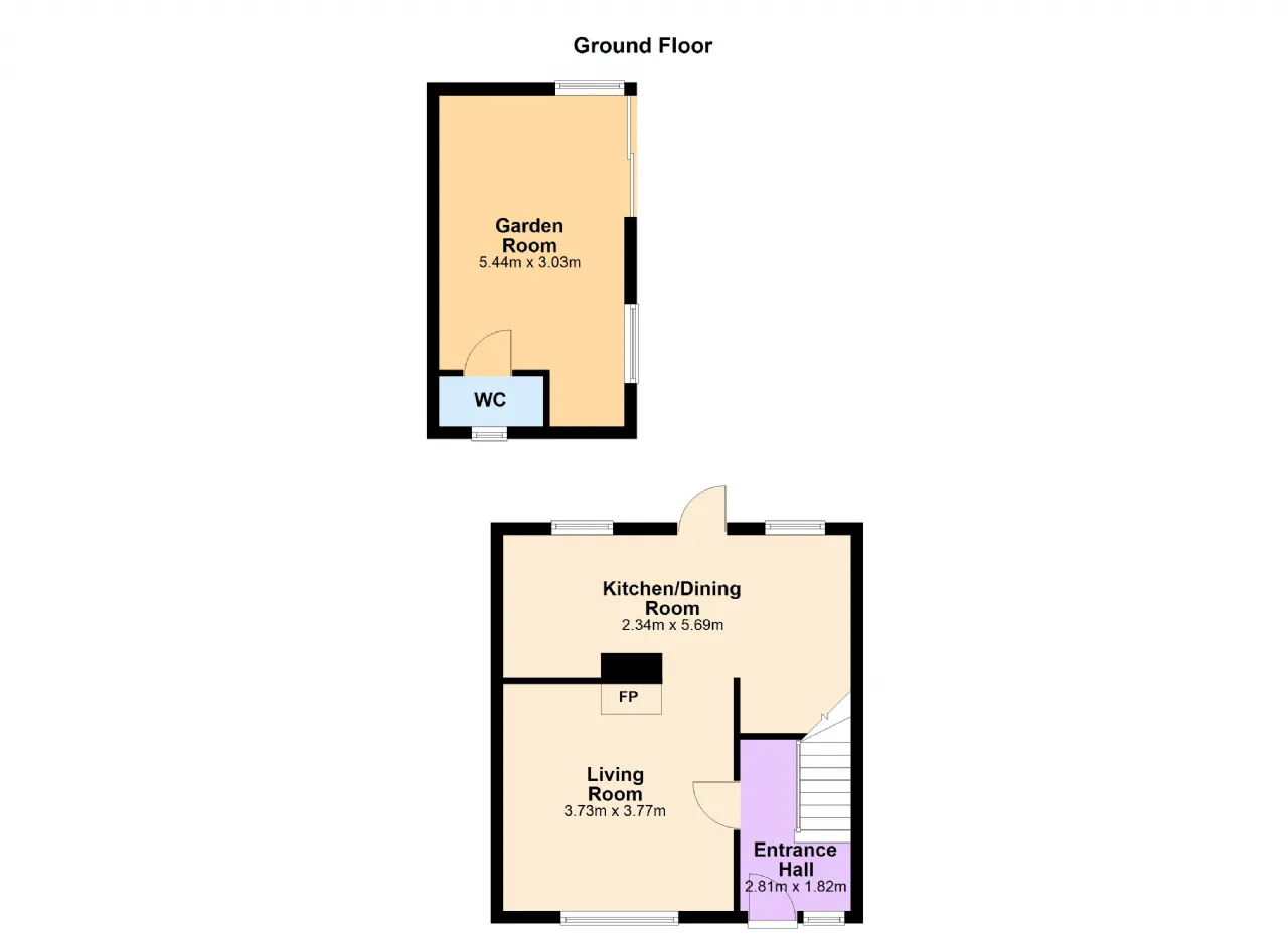 Kitchen/ Dining Area 2.34m x 5.69m Fitted cupboards, worktops, integrated fridge/ freezer provision, plumbing for washer/ dryer & dishwasher, 4-ring hob + oven + extractor, door to rear garden.