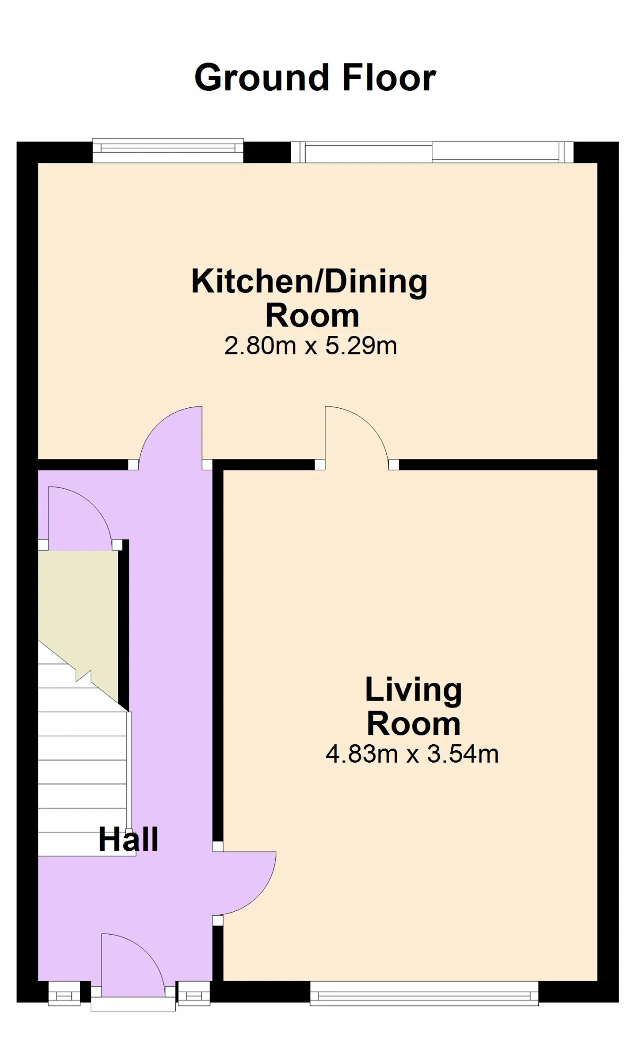 Living Room 4.83m x 3.54m Built in shelving, large window overlooking garden to front. Door to