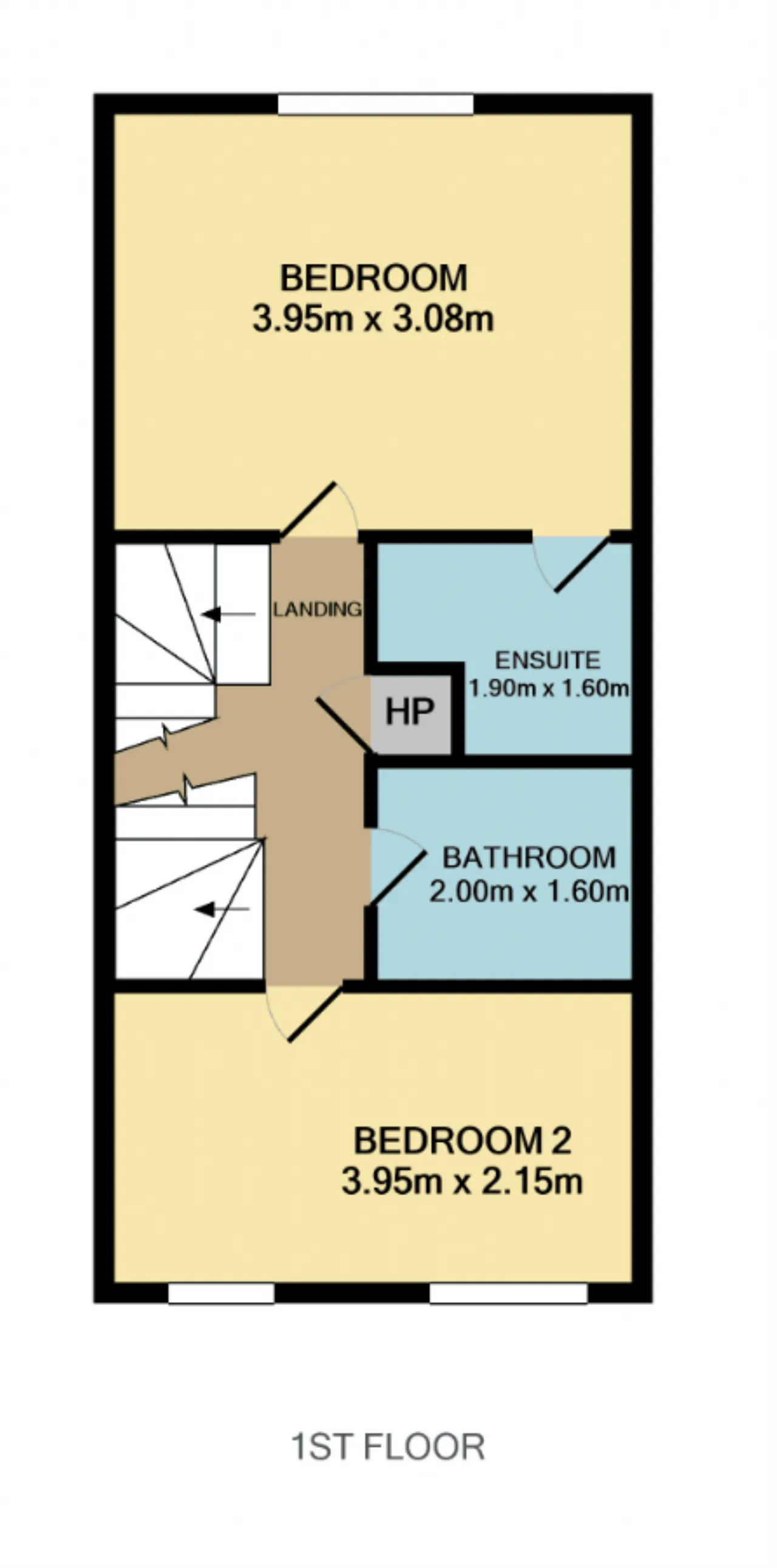 Bedroom 1 3.95m x 3.08m Generous double bedroom to the rear featuring a large rear-facing window, built-in sliding wardrobes, and finished with wooden effect flooring.