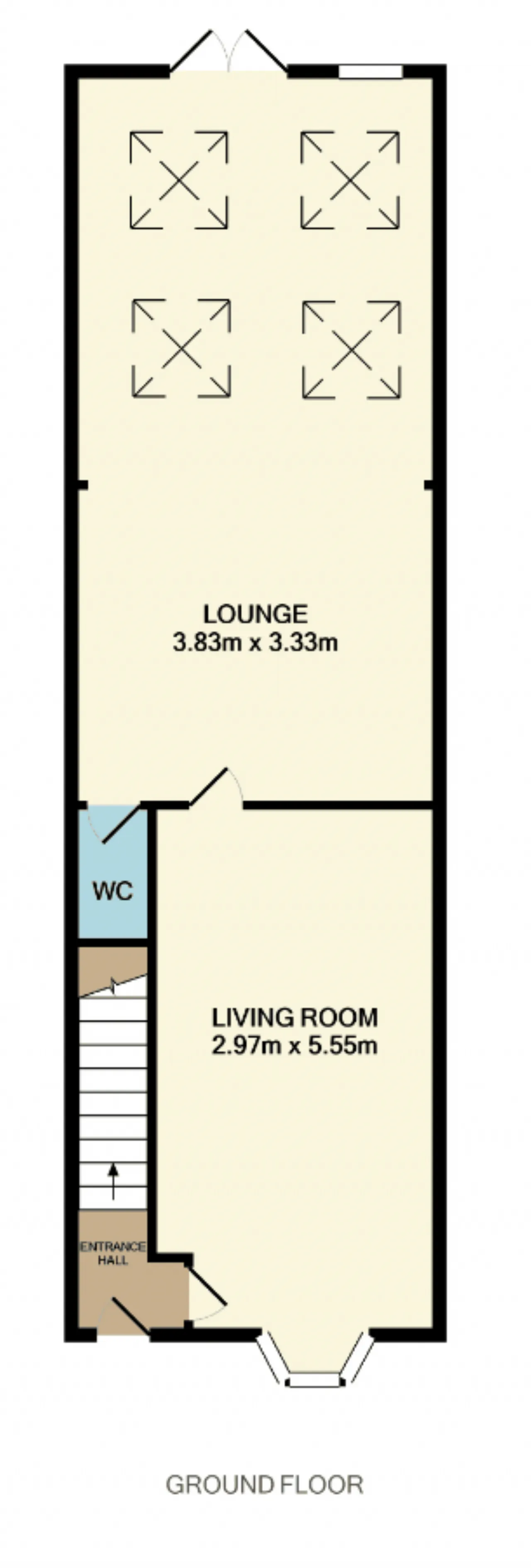 Kitchen/Dining Room 3.83m x 3.33m Contemporary white fitted kitchen is finished with wooden-effect flooring and recessed lighting. Integrated appliances include an oven, gas hob, extractor fan and fridge/freezer. Double doors provide direct access to the rear garden while the four velux windows fill the room with natural light.