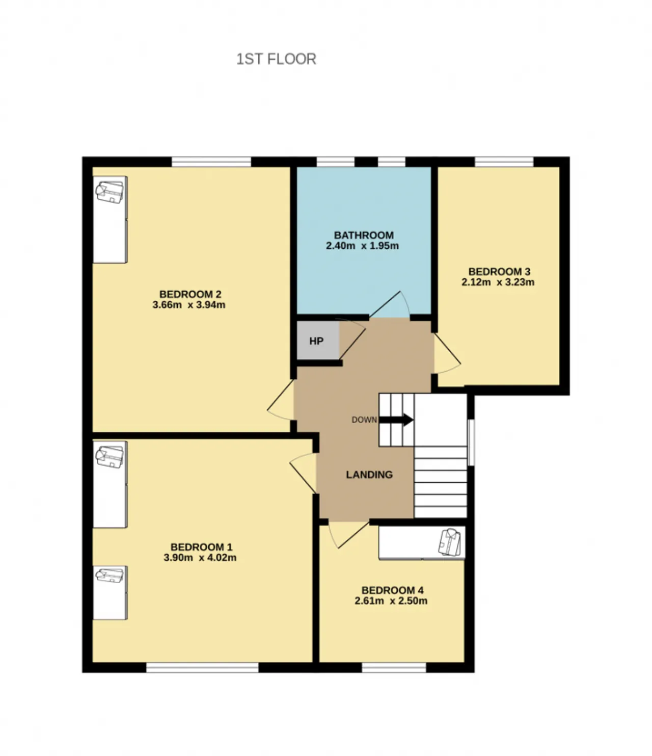 Bedroom 1 4.02m x 3.90m Double room to the front with carpet flooring and fitted wardrobes.