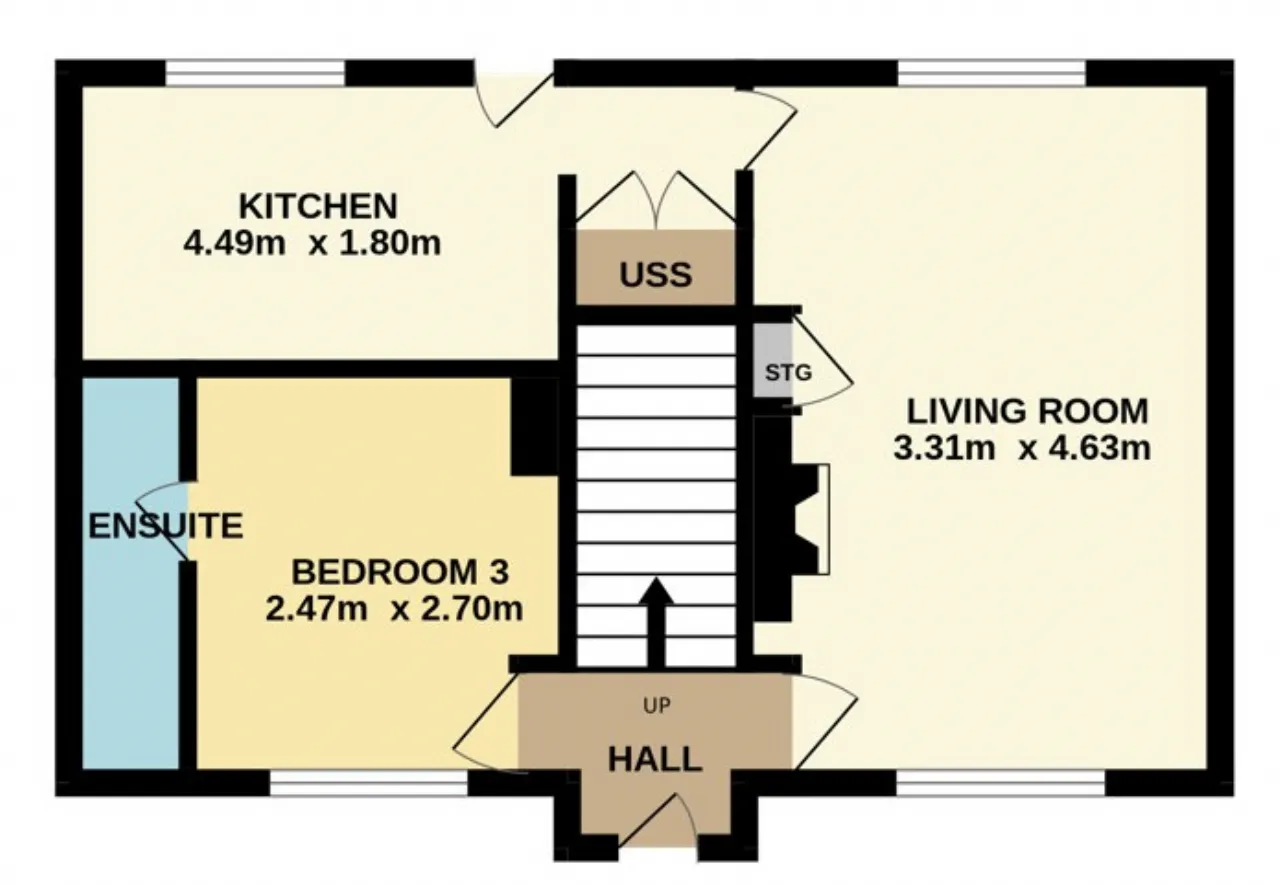 Measuring approximately 77sq.m (829sq.ft), the accommodation briefly comprises an inviting entrance hall, a bright living room with dual aspect and an attractive fireplace, a kitchen and a ground floor bedroom complete with en-suite. Upstairs, there are two spacious double bedrooms with built-in storage and a family bathroom.