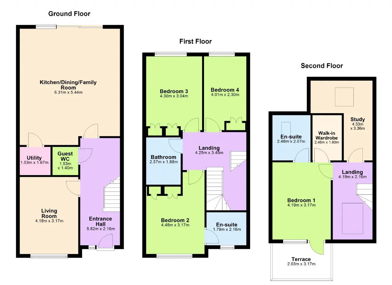 At first-floor level, a spacious landing with fitted carpets is illuminated by a large overhead roof light. The second bedroom, positioned to the front of the property, includes fitted wardrobes, decorative panelling and an en-suite shower room with a rainfall shower head. Bedroom three is a well-proportioned double with fitted wardrobes, while bedroom four is currently used as a studio. A bespoke family bathroom by Bath House completes the first-floor accommodation.