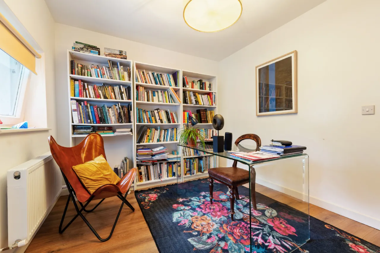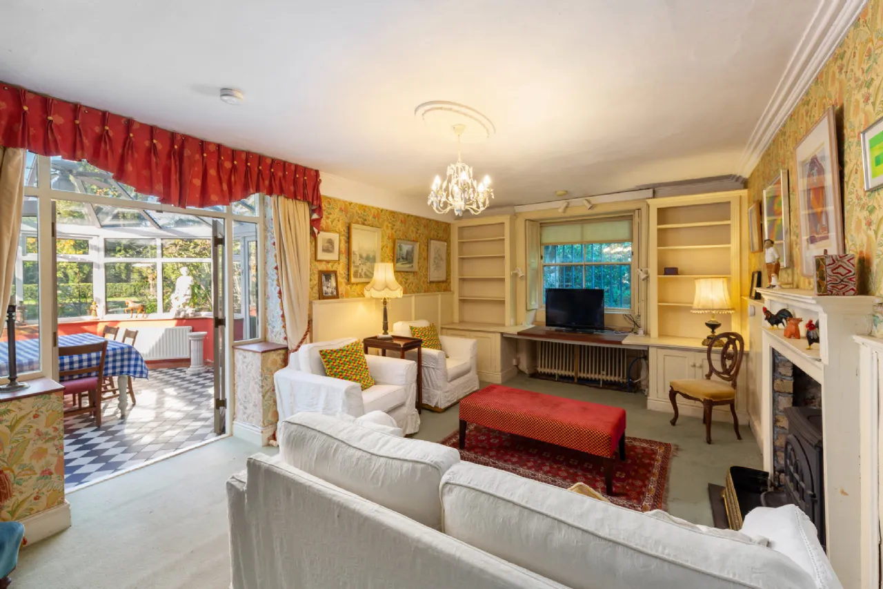 TV room nicely appointed with large fireplace with wood burning stove. Fitted desk unit and bookshelves. This room would once have opened into the adjoining study and could easily be reconfigured by removing the dividing bookcase.