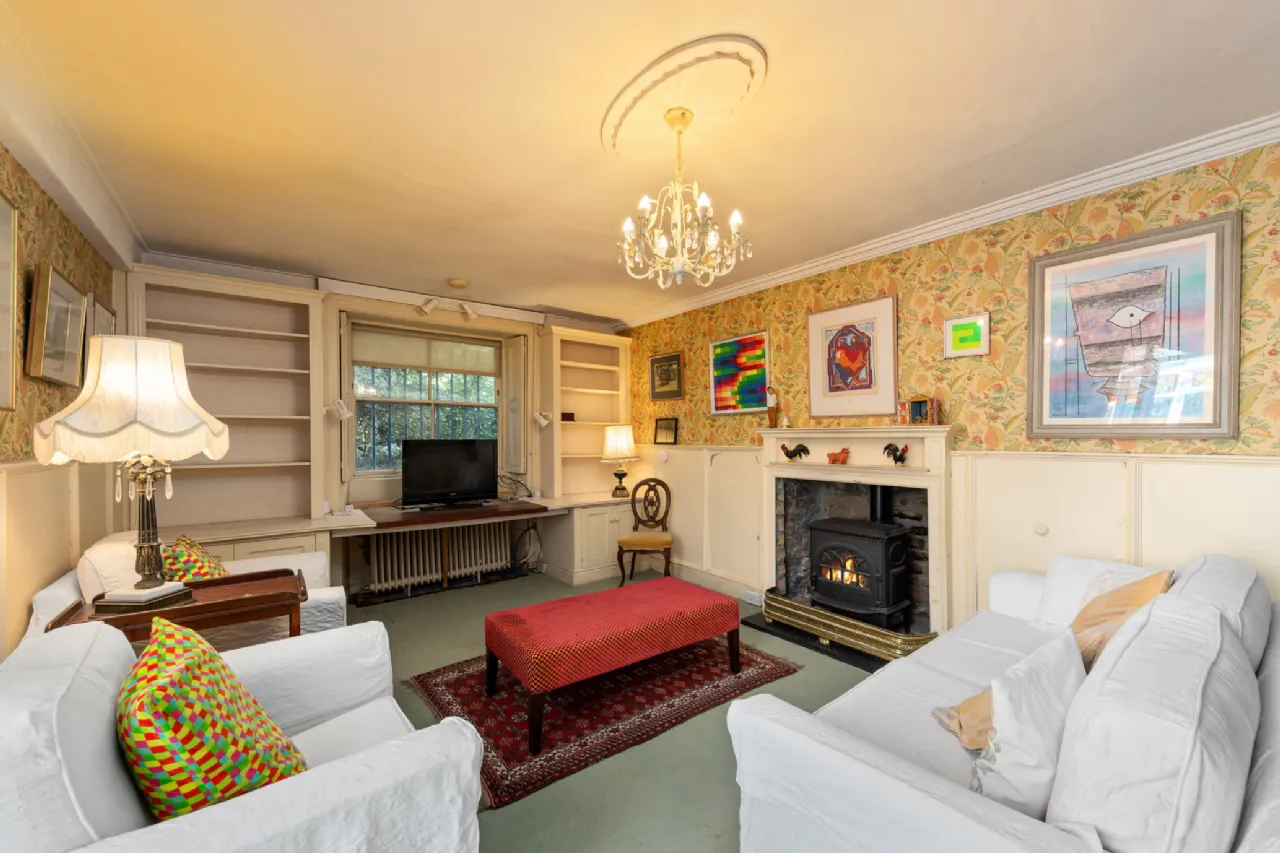 Dining room/library another stunning room with sea glimpses from the northerly window. Ornate ceiling coving and centre rose with feature grape detail. Handsome Oak fireplace with wood burning stove. Exposed original oak floor boards. Door to