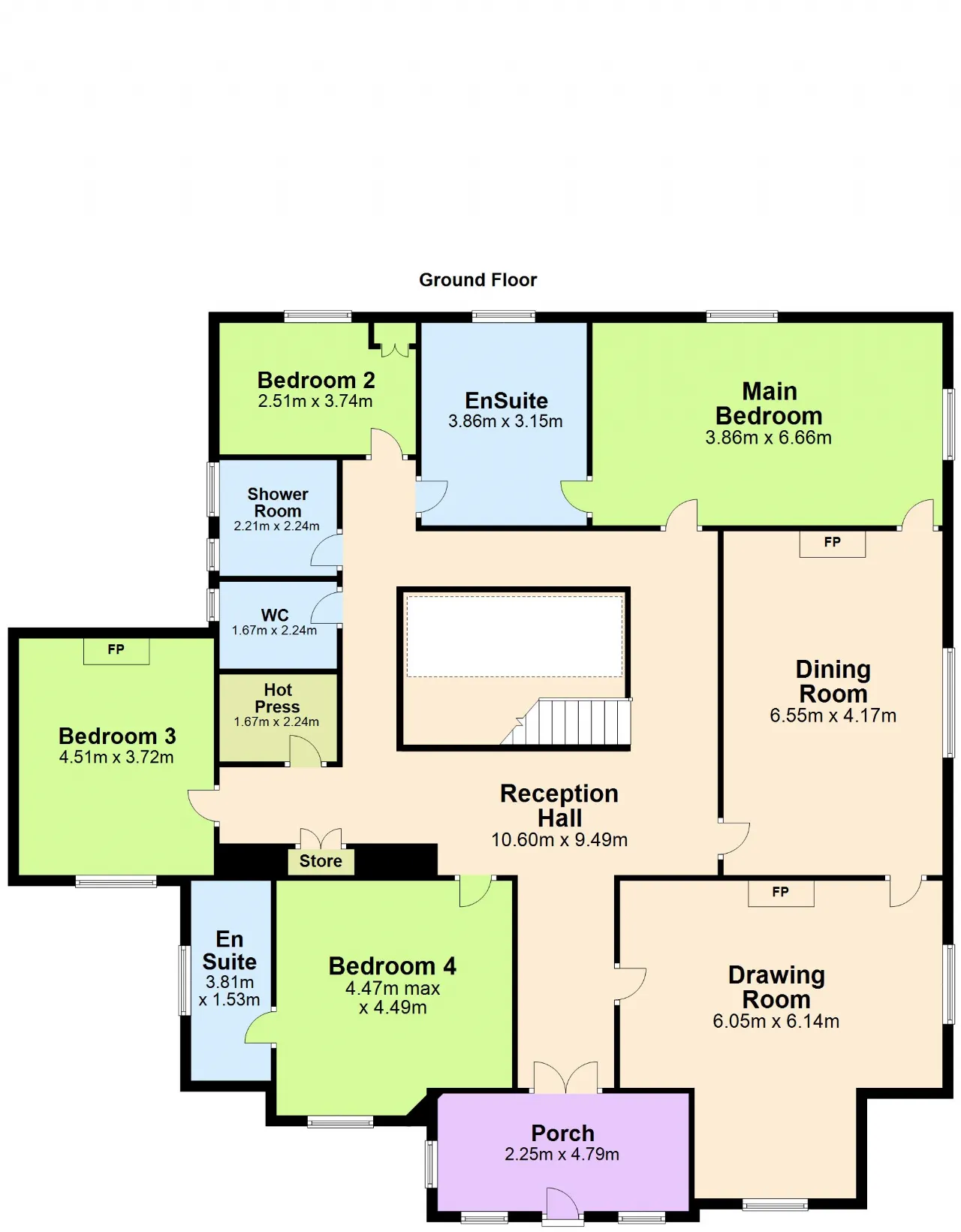 In addition, there are three more bedrooms (one with an en-suite), a separate shower room, and a WC, all accessible from the central hallway.