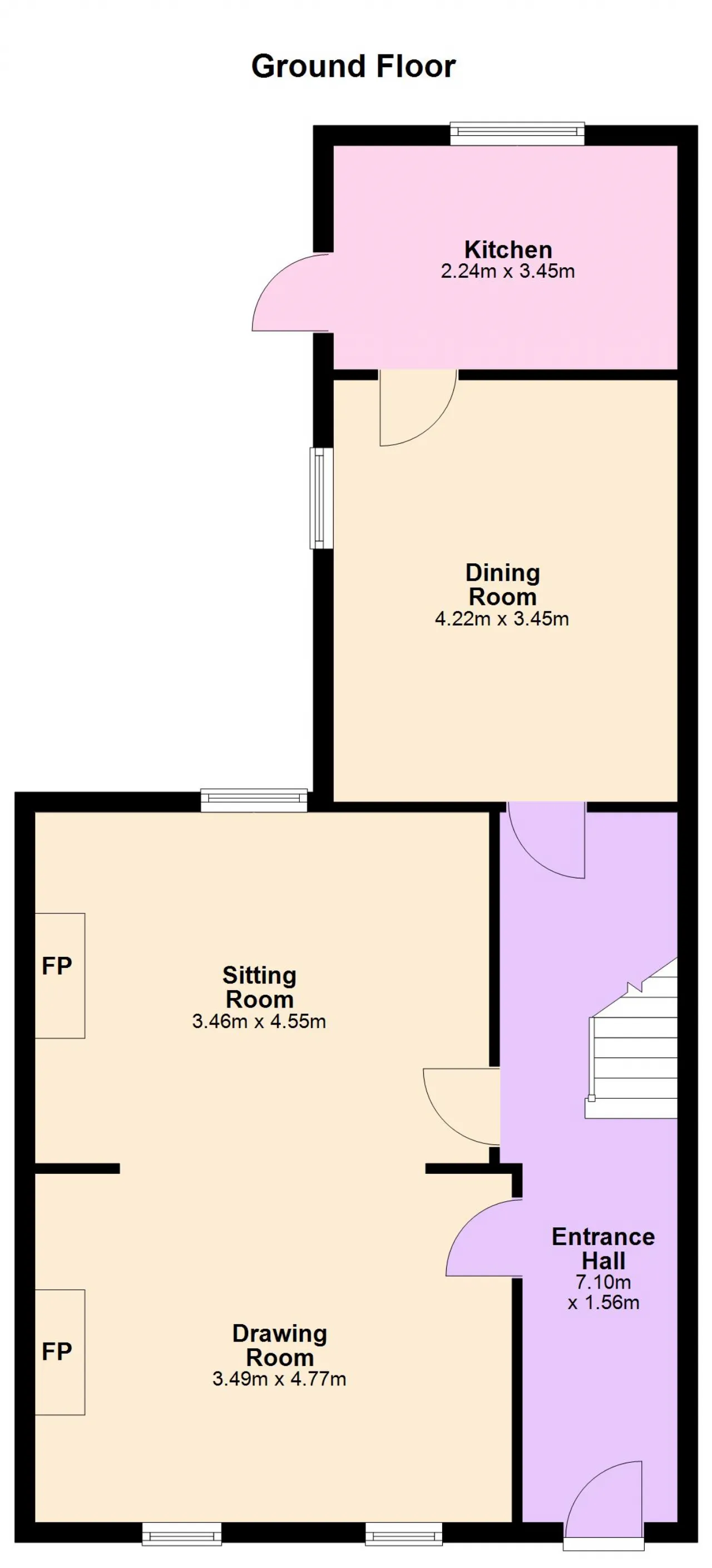 Drawing Room 3.49m x 4.77m Bright reception room with two windows overlooking the front garden, includes picture rail and ceiling coving. The living room features an open fireplace with tiled inset. Hearth and surround, flanked by fitted shelving. An archway leads to the sitting room.