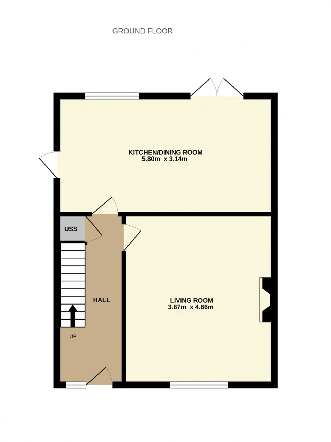 Kitchen/Dining Rooom 5.80m x 3.14m Inviting kicthen/dining room with tiled flooring, built in kitchen cabinets and french doors to the rear garden.