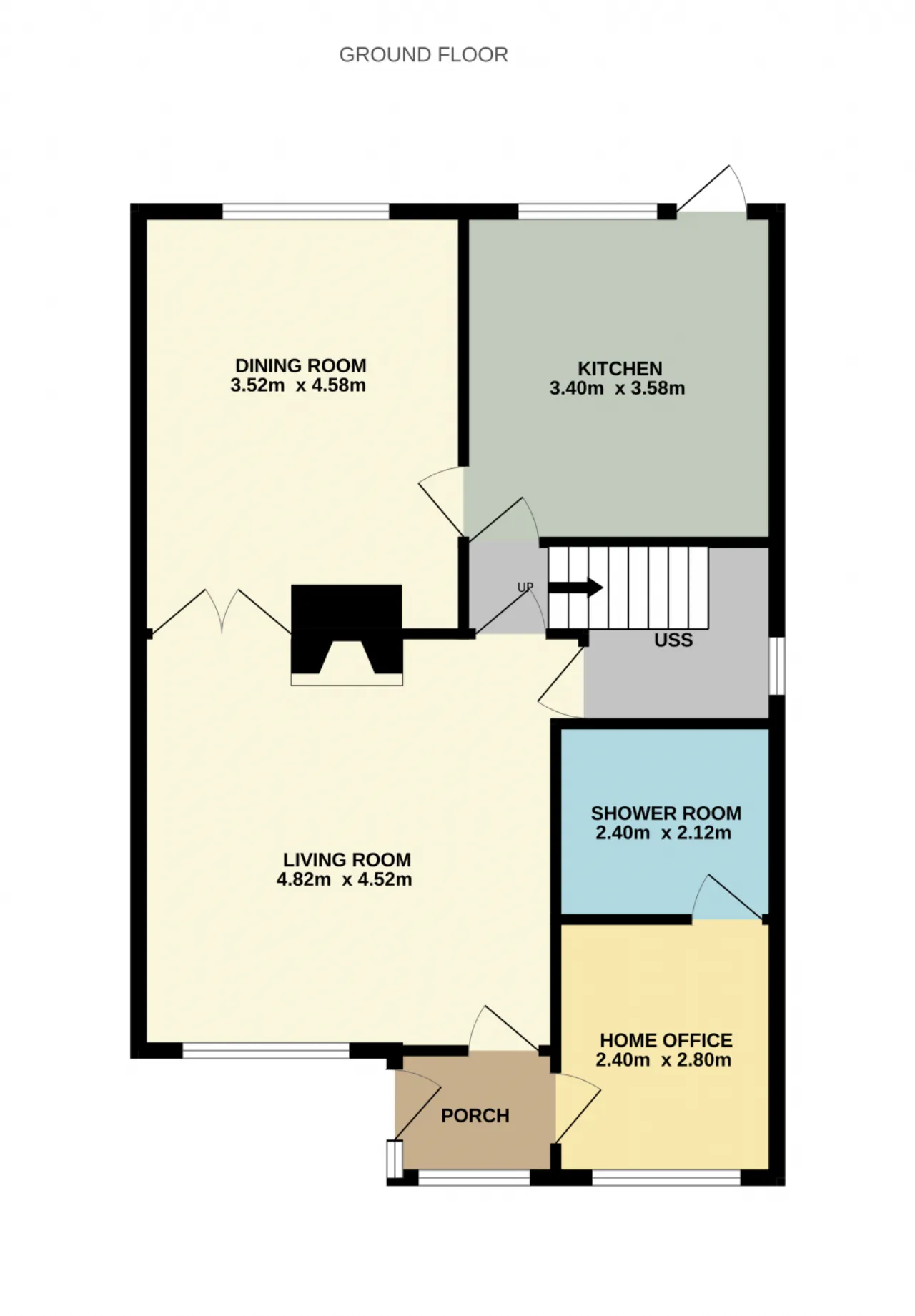 Living Room 4.52m x 4.52m With wood flooring, gas fireplace, double doors leading into dining room, and large walk in understairs storage space.