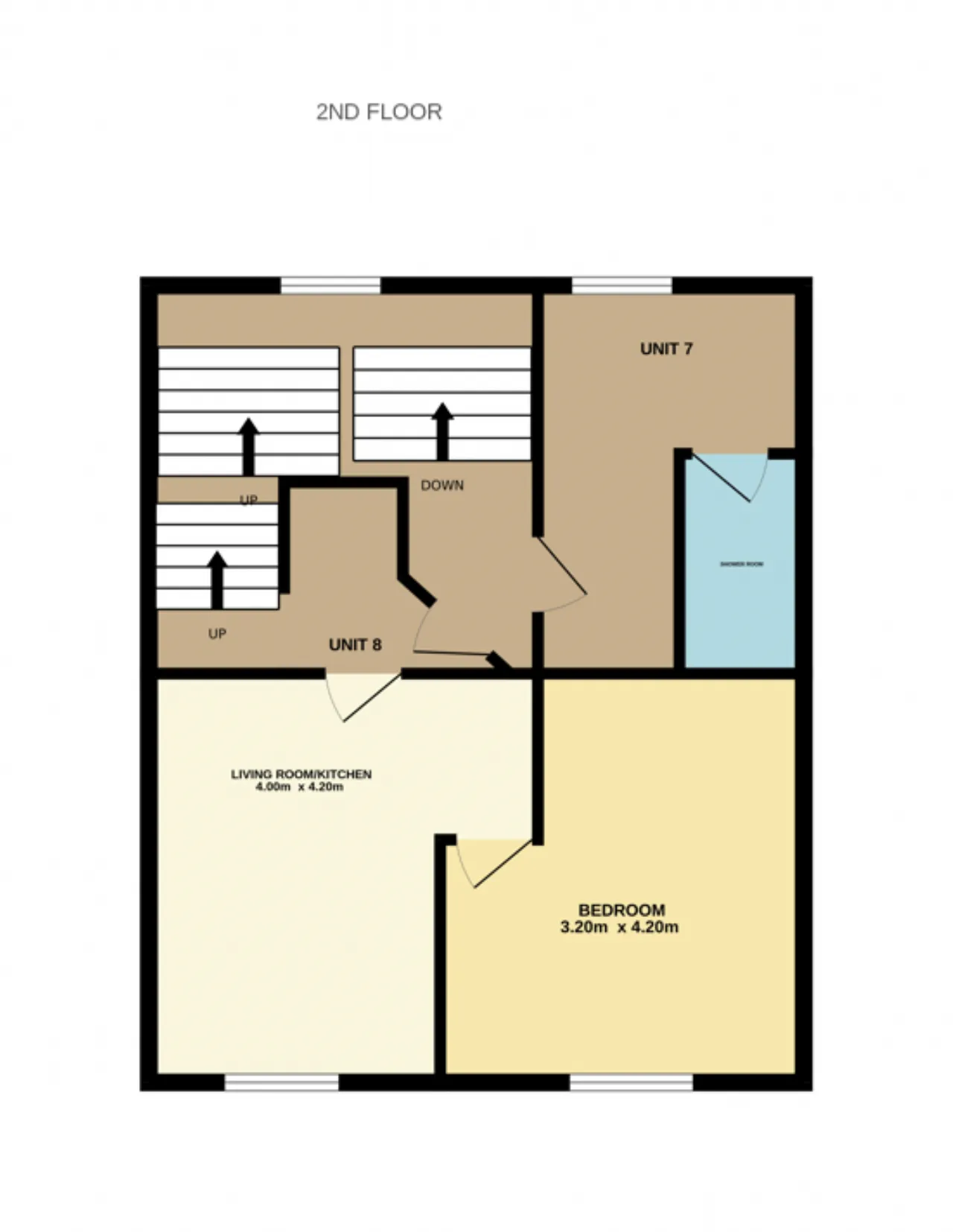 Studio 4.3m x 4m Located on the second floor and fitted with floor and wall units.