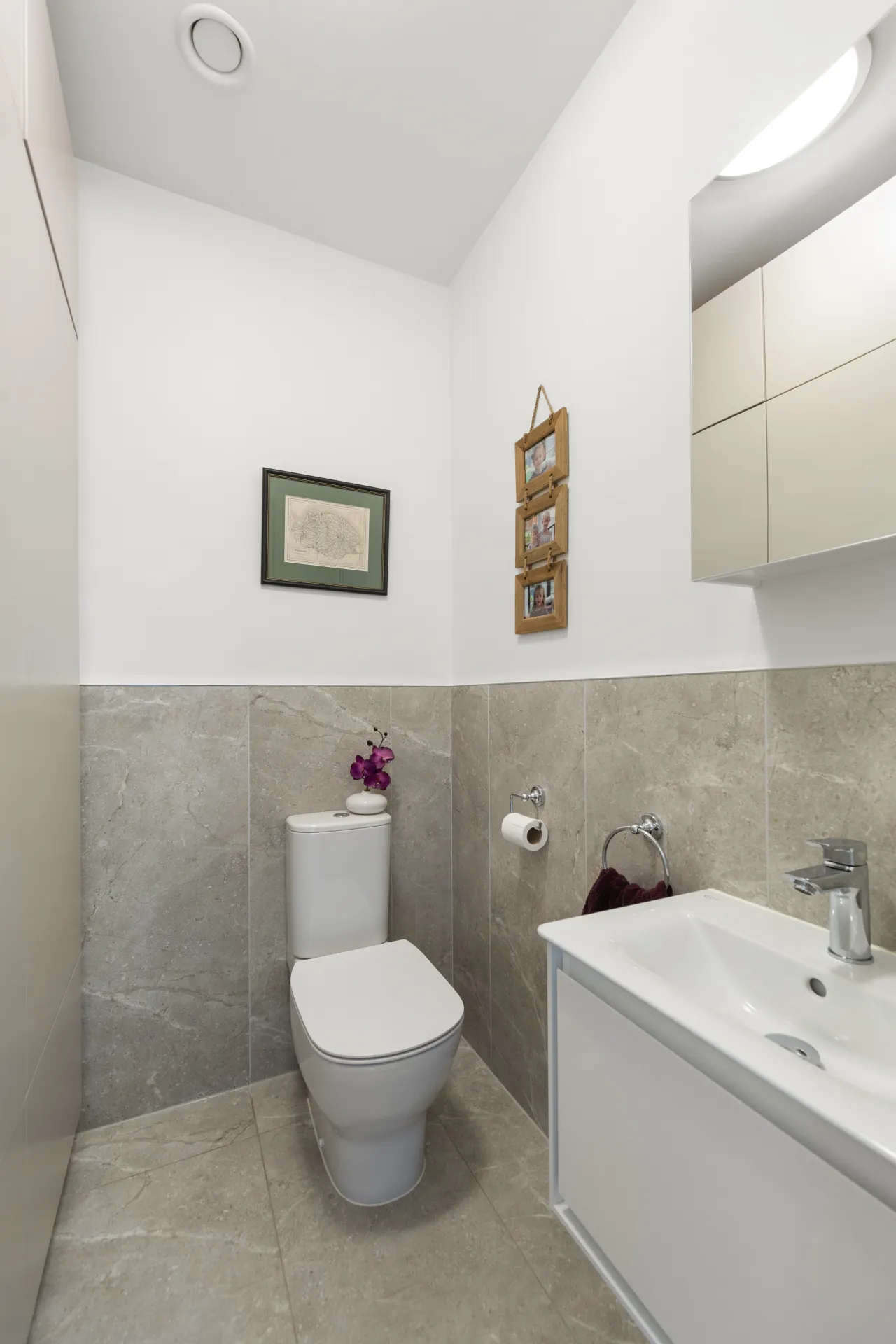 Guest WC partly tiled walls and tiled floor, WC, wash handbasin inset in vanity unit and bespoke fitted storage cabinets.
