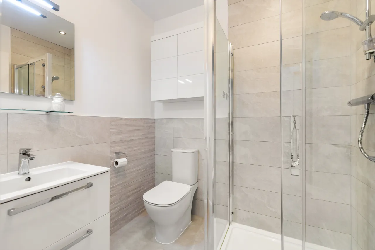Shower room 2.07m x 1.72m Partly tiled walls and tiled floor with vanity mirror & light over, wash hand basin and set in vanity unit, WC, fit storage cabinet, shower cubicle with sliding glass door, heated towel rail.