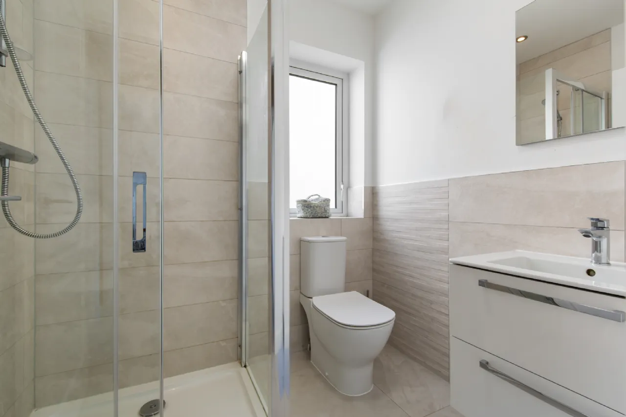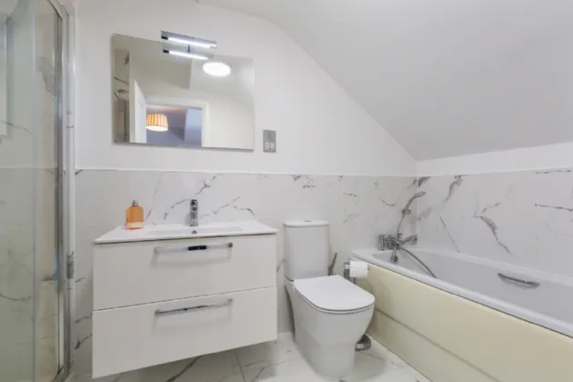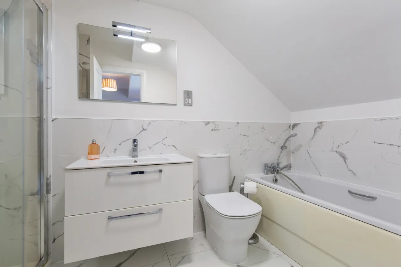 En-Suite 3.21m x 1.71m marble effect tiled floor and part tiled walls, sink with under sink storage, w.c., bath with shower attachment, recessed lights, large shower cubicle with rainwater showerhead and secondary shower attachment