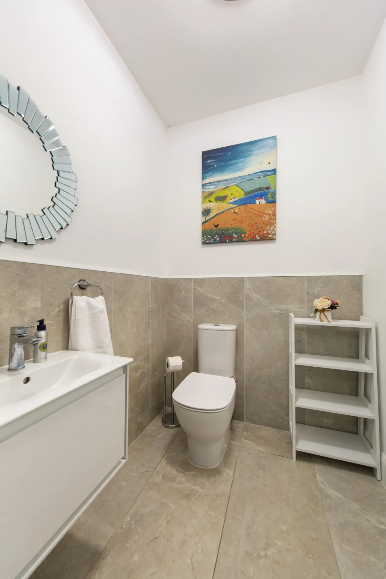 Guest WC 1.52m x 1.64m tiled floor and part tiled walls, w.c., w.h.b. with under sink storage, wall mounted coat storage