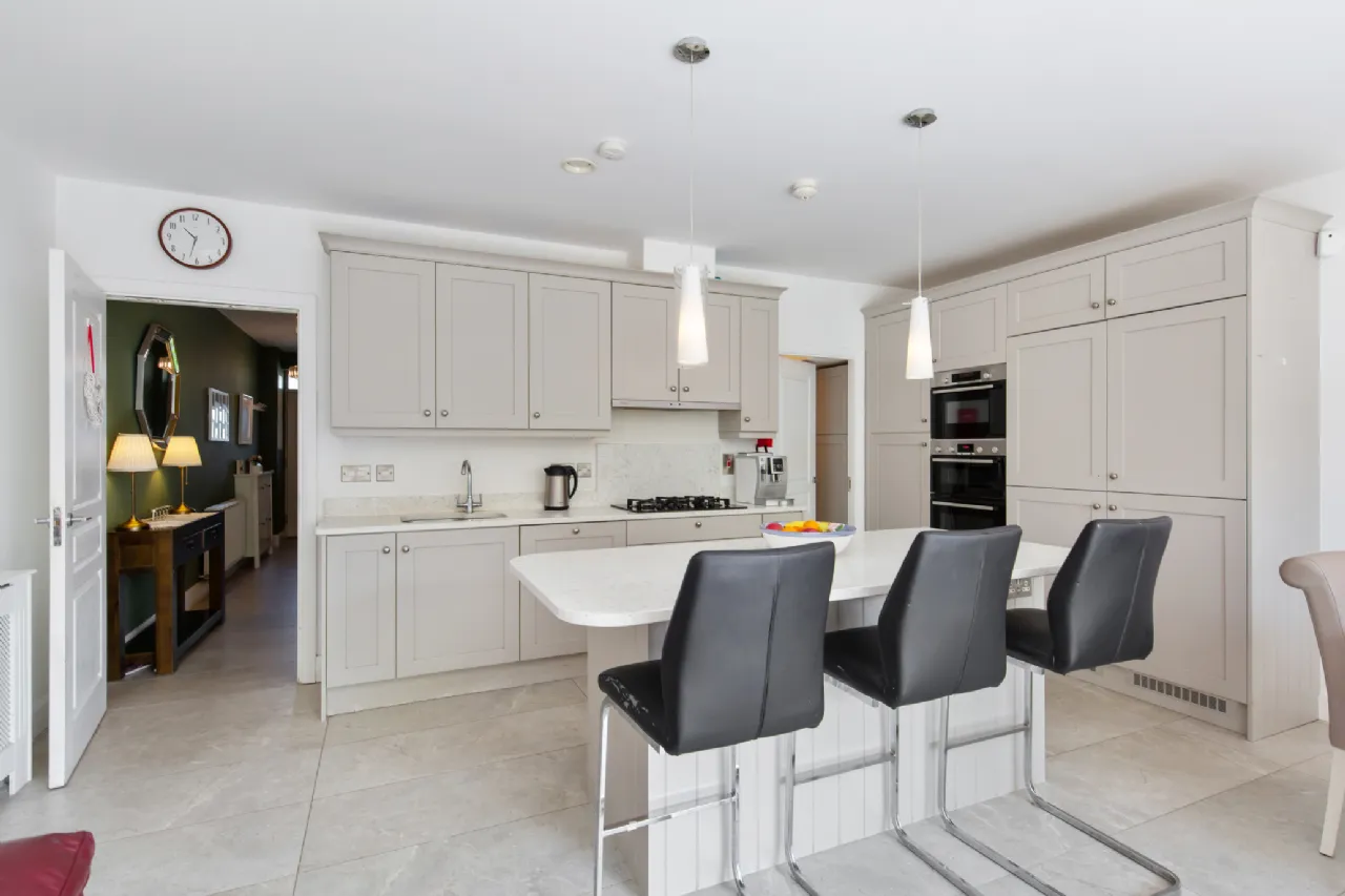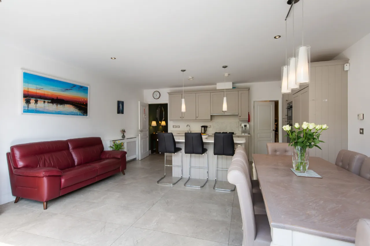 Kitchen/Living/Dining 6.02m x 5.42mm good range of Shaker style fitted units with granite countertop, four ring gas hob, extractor fan, integrated double oven, integrated fridge/freezer, integrated dishwasher, island unit supplied with electricity, granite countertop and pull out bin cupboard, recessed lighting. tiled floor, sliding door to south facing garden